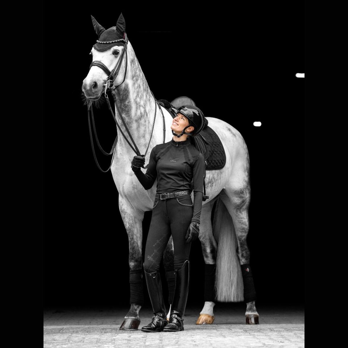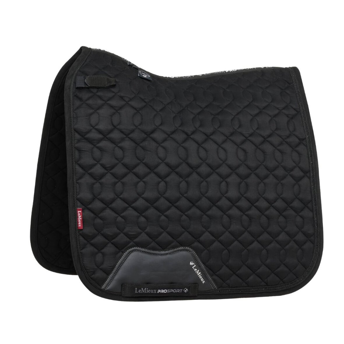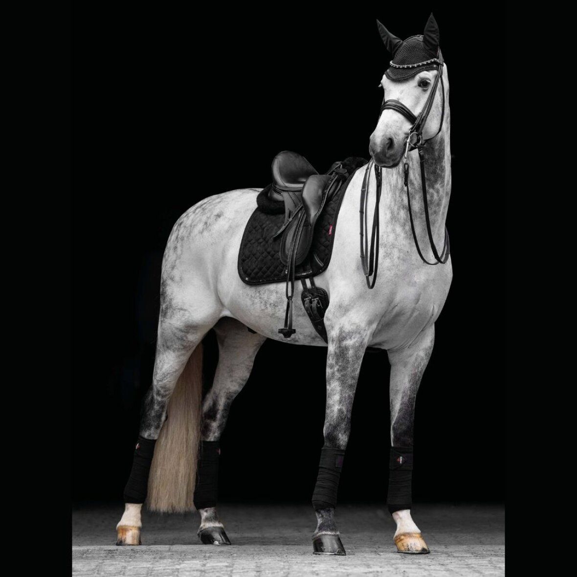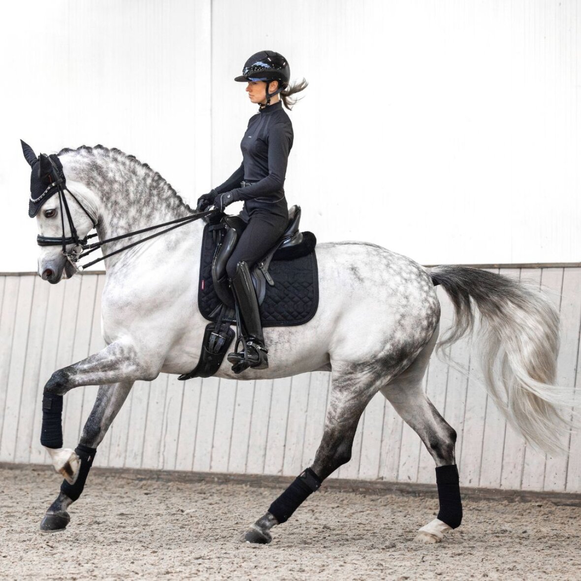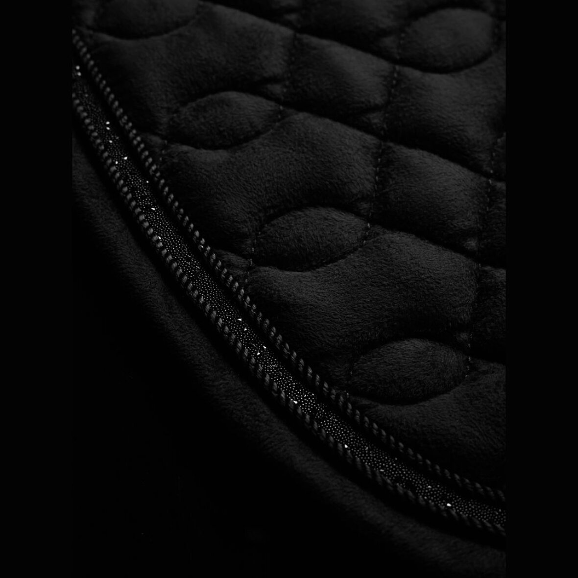 Crystal suede dressur underlag fra LeMieux, med et virkelig smuk quiltet mønster. Dressur underlaget er fremstillet med en bambus foring som er yderst åndbar, svedabsorberende og har hurtigtørrende egenskaber. Underlaget er med sort krystalglimmer pipe rundt langs kanten og giver et virkelig flot look. Underlaget er med læder forstærkning ved gjorden på begge sider og har velcrostropper til fastgørelse.