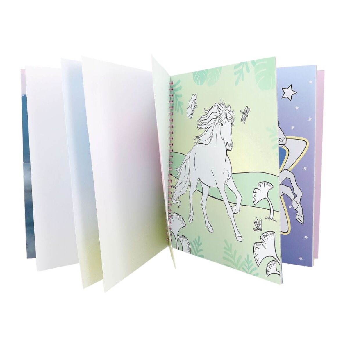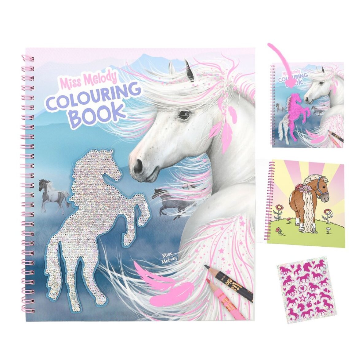 På forsiden af denne fine malebog fra Miss Melody finder du en stejlende hest i vendbare pailletter, som ved et stryg med hånden skifter farve. Det er simpelthen så cool! Inde i bogen er der 20 sider med smukke hestemotiver, der blot venter på at bliver farvelagte og dekorerede med farver og de medfølgende stickers. Med denne bog er der lagt op til god underholdning, hvor du kan udforske din kreativitet og skabe dine egne hesteskønne kunstværker.