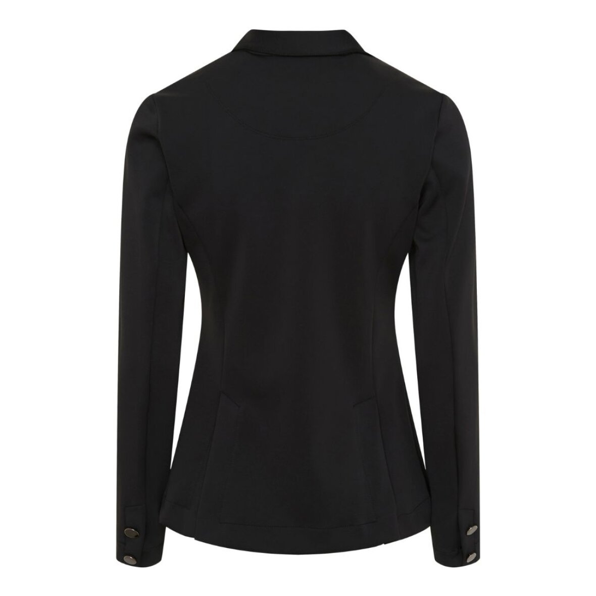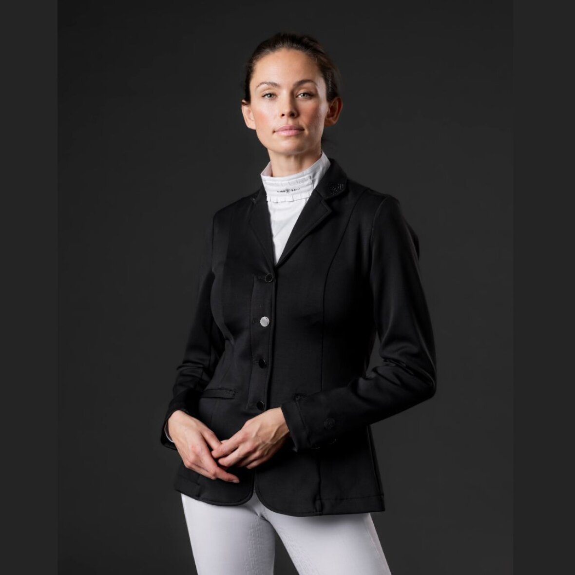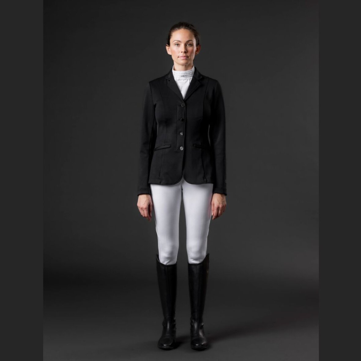 Glat softshell stævneridejakke fra Equipage. Stævnejakken lukkes med lynlås og knapper i fronten. Stævnejakken er fremstillet i stærk- og åndbart materiale som er figursyet. Stævnejakken er med sorte rhinesten mønster på lidt af kraven foran, den har lynlåslommer i fronten med sorte rhinesten mønster. 2 slidser bagtil for at den falder pænt når du sidder i sadlen.