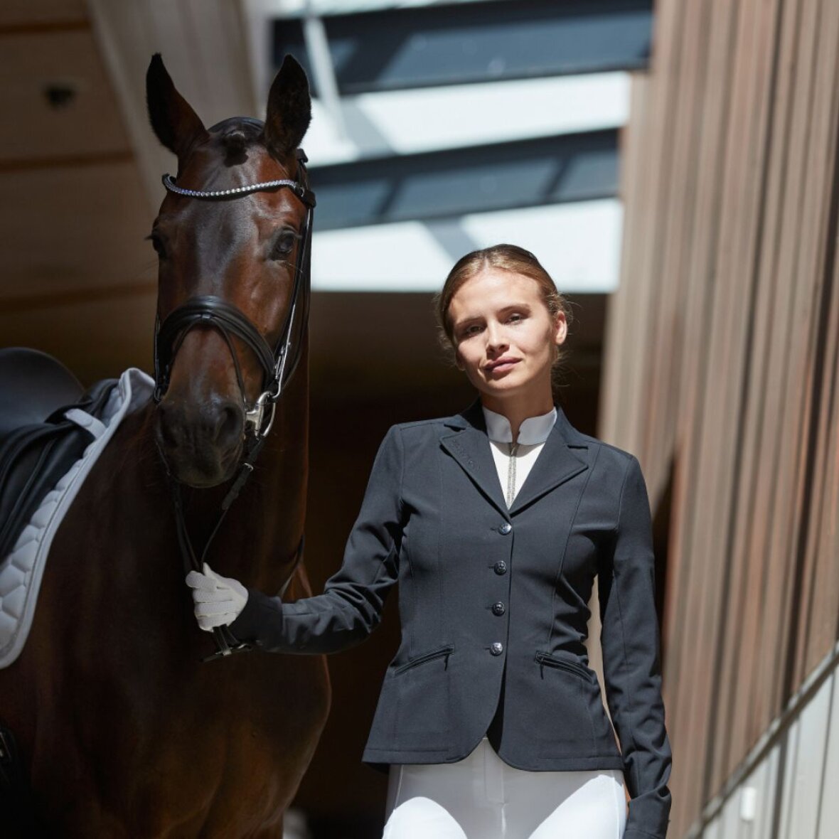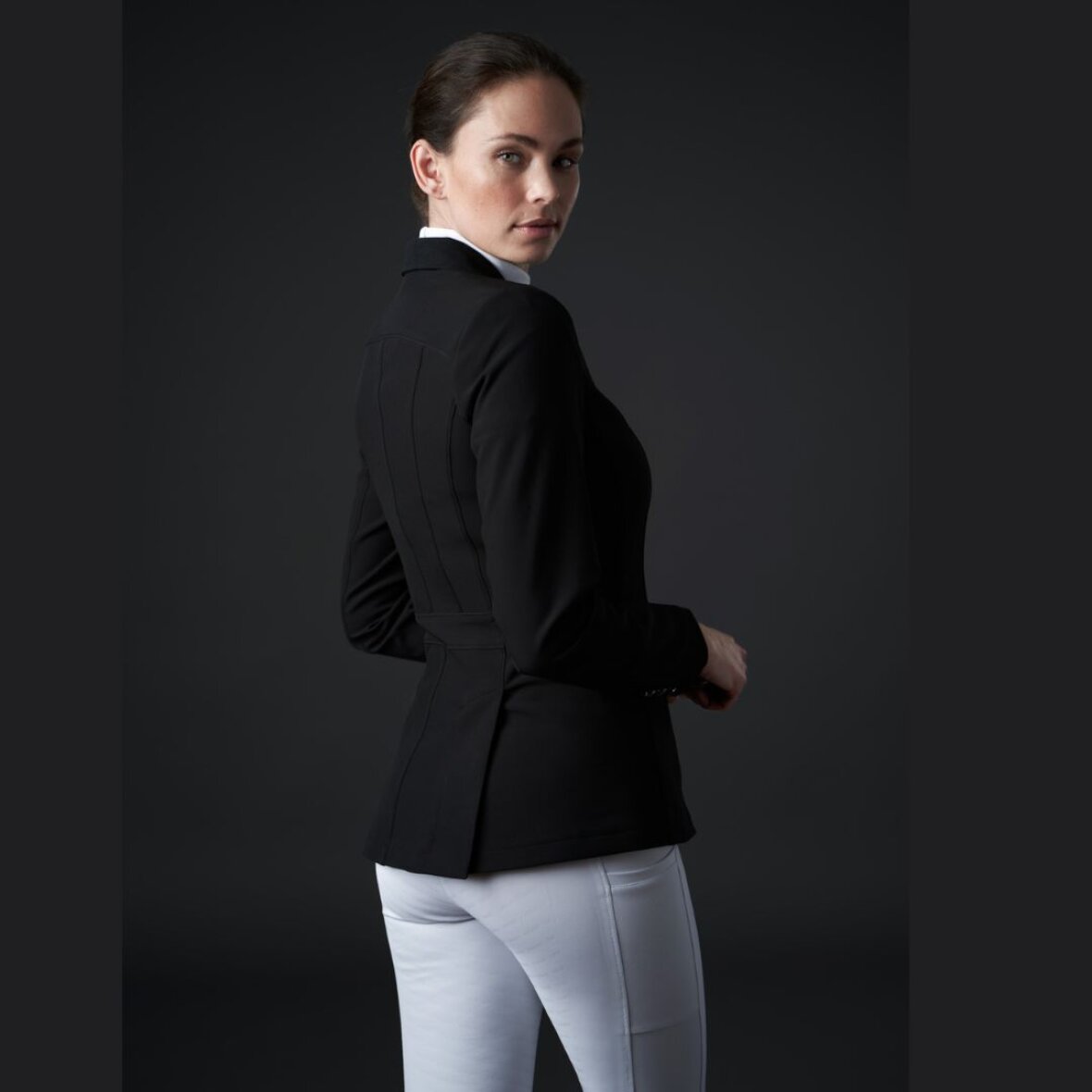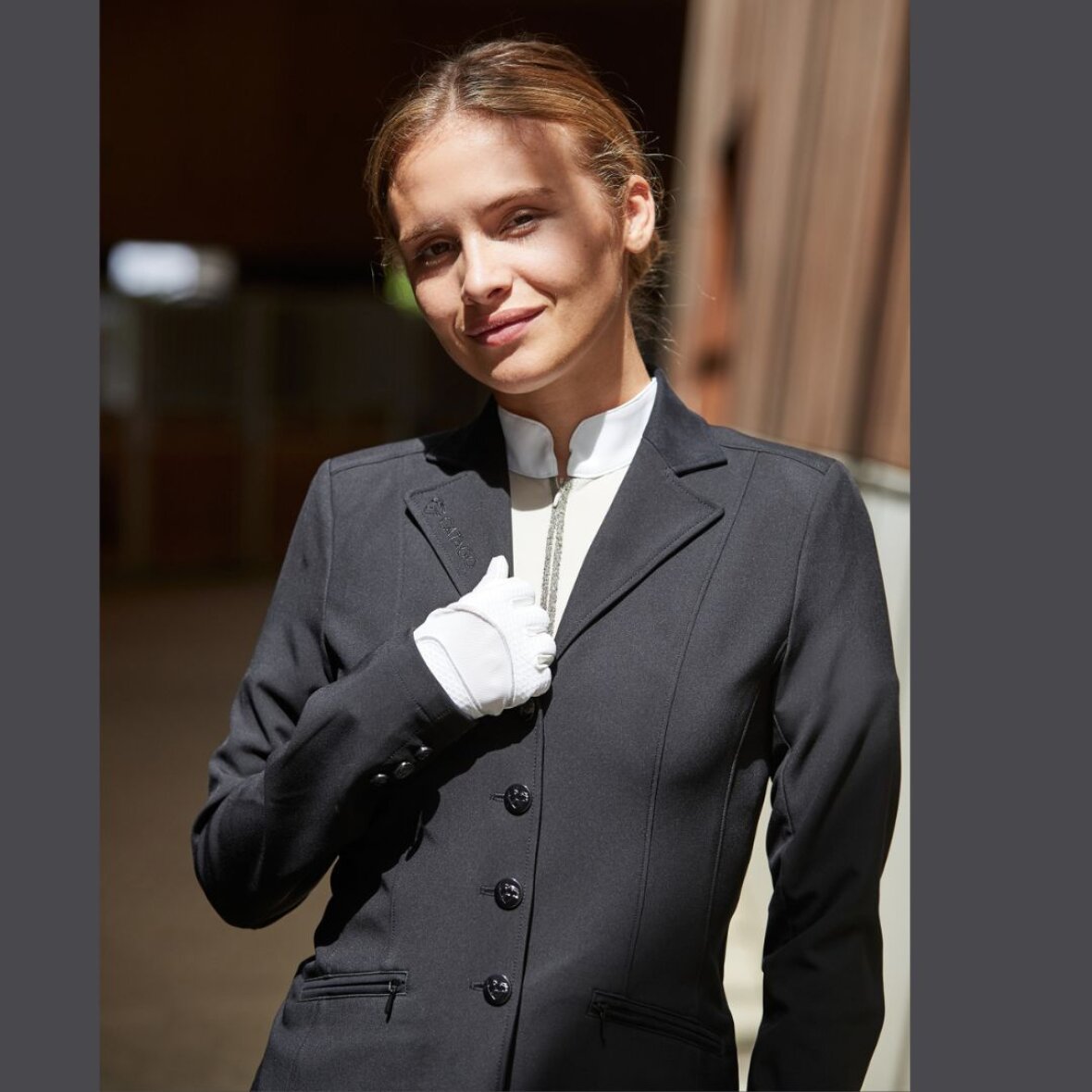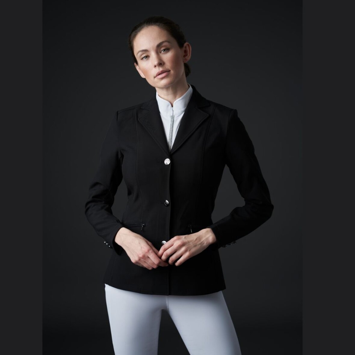 Klassisk og enkel stævnejakke fra Catago. Den er funktionel og fremstillet i stræk- og åndbart materiale som giver rytteren en god bevægelsefrihed. Den er figursyet og i glat materiale som gør den nem at rengøre. Stævnejakken lukkes med lynlås og 4 knapper og har 2 lynlåslommer i fronten med imiteret ruskind på kanten. Slidser så den falder pænt når man sidder i sadlen og god ventilation på bagsiden.