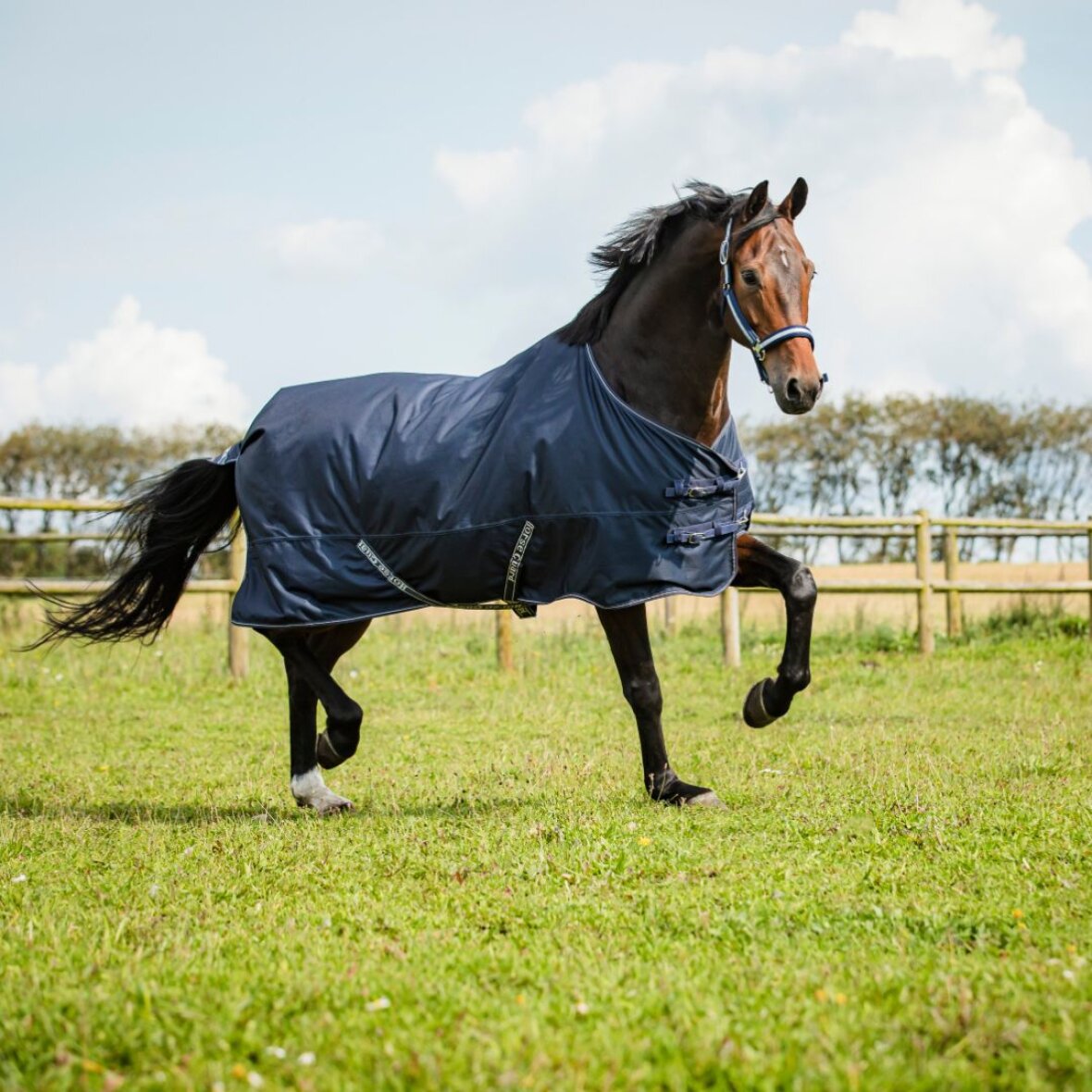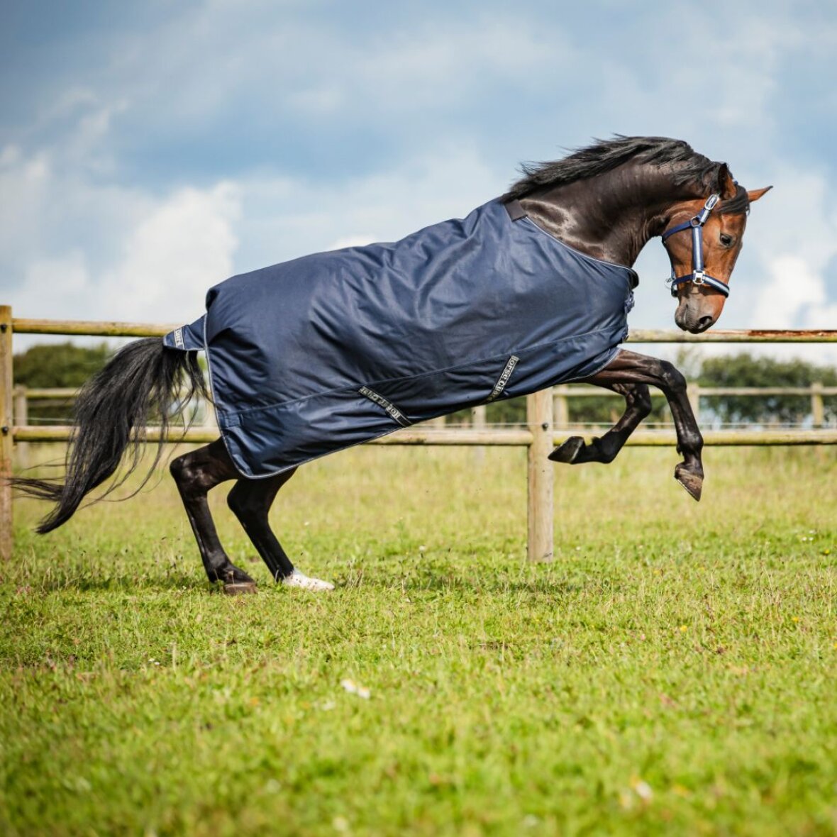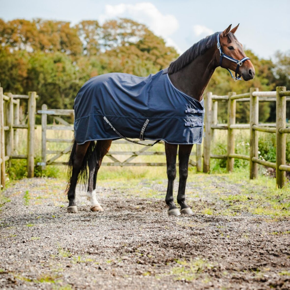 Regndækken fra HorseGuard med 0 g fyld og 1200 D. Dækkenet er fremstillet i vand- og vindtæt materiale. Det er med dobbelt spænde ved bringen med karabinhager og har justerbare mavestopper. Vandsøjletryk 5000mm.
