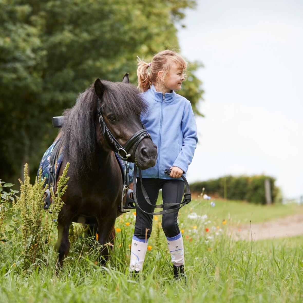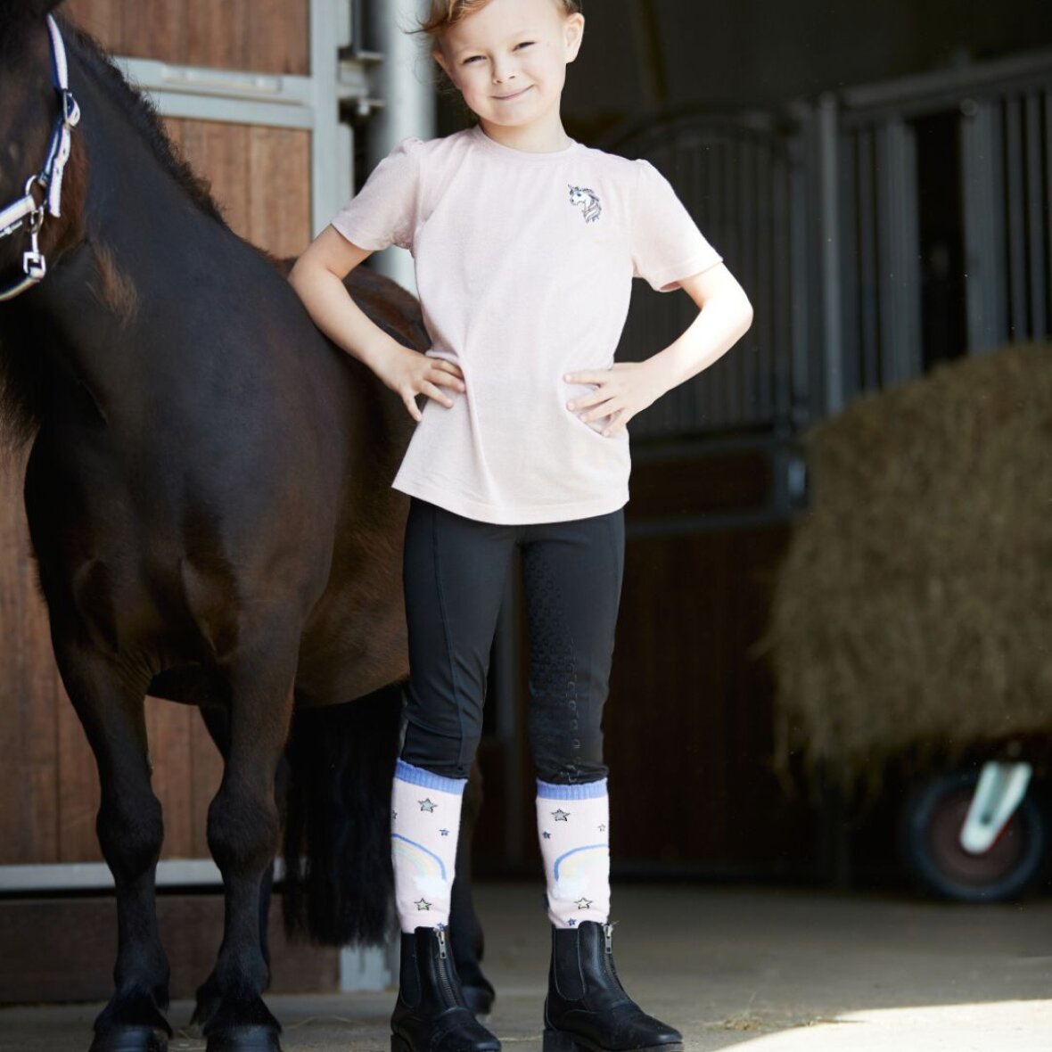Børne ridetights fra Equipage. Disse ridetights er med høj talje med bred elastik linning, som har knappe justering indvendig. De er med fuld silikone grip og er fremstillet i ånd- og stækbart materiale.