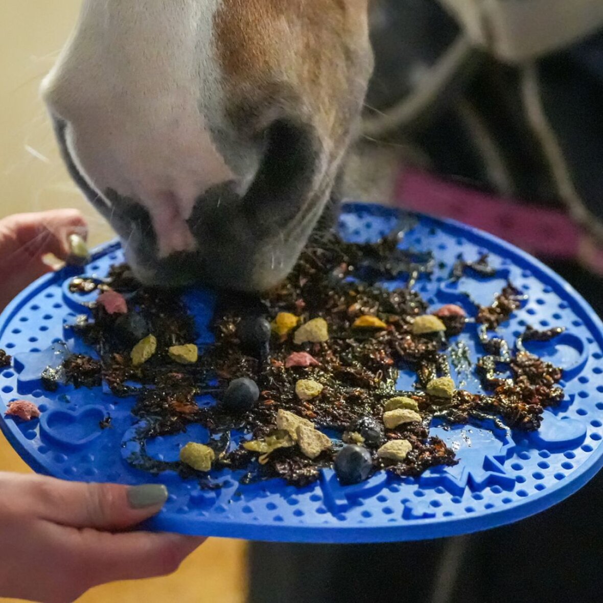 Slikmåtte til at beskæftige hesten fra Waldhausen. Denne gummimåtte er et virkelig godt redskab til at underholde hesten, enten på staldgangen eller måtten kan lægges i en spand og bruges som slowfeeder. Slikmåtten kan smøres med Graze paste som klister til måtten og gør at hesten skal bruge lang tid på at slikken den ren, men det er kun fantasien som sætter grænser for hvilke opskrifter der kan bruges på denne måtte.