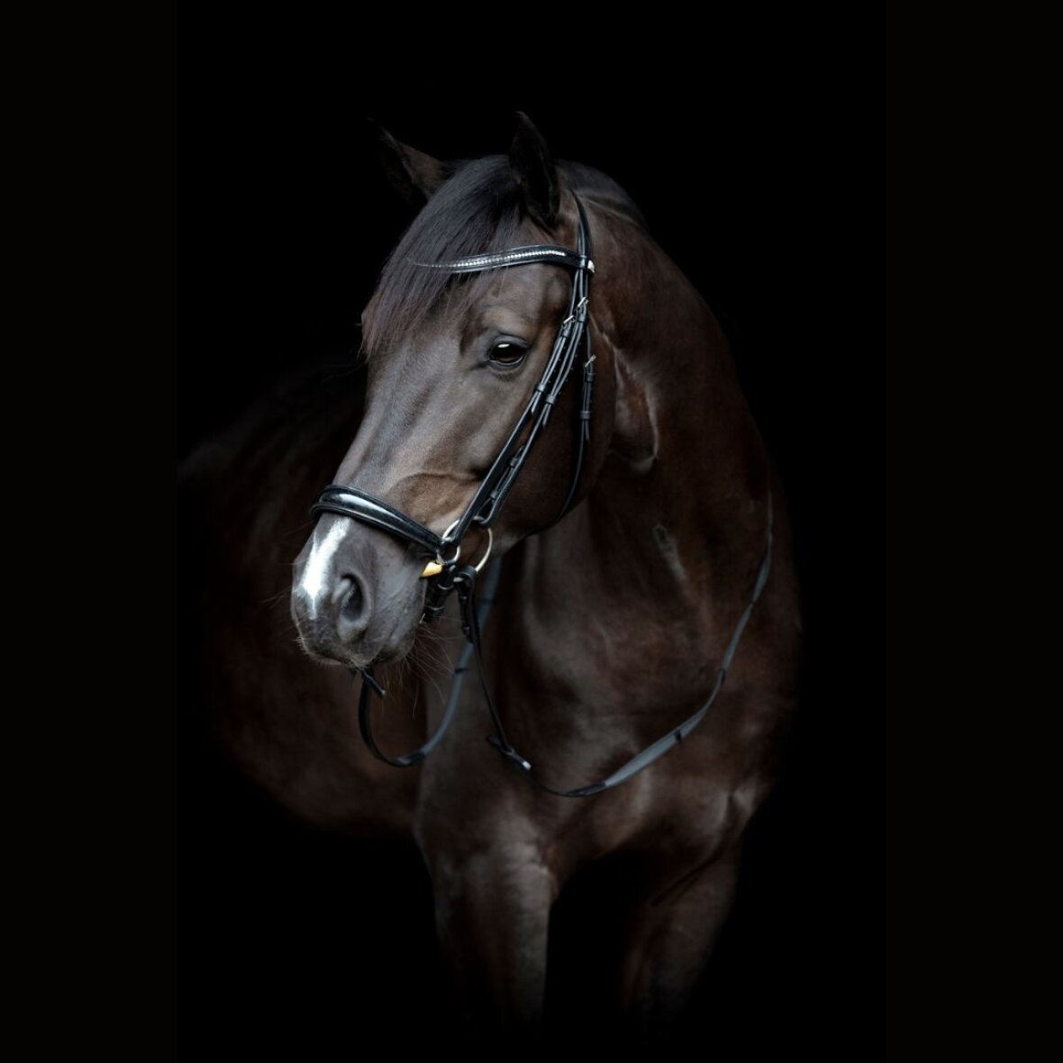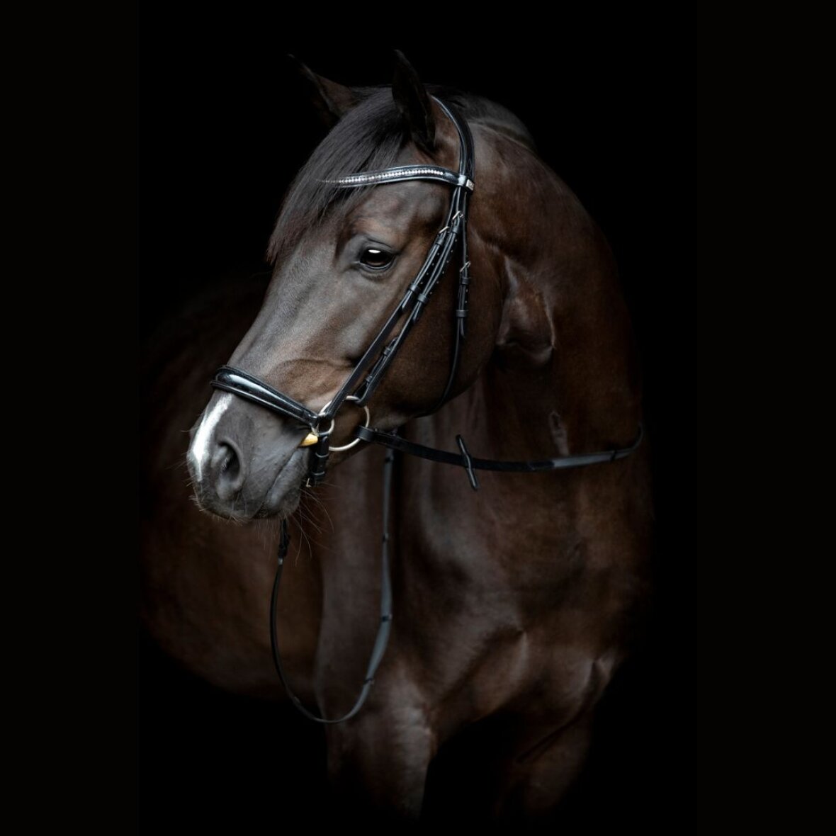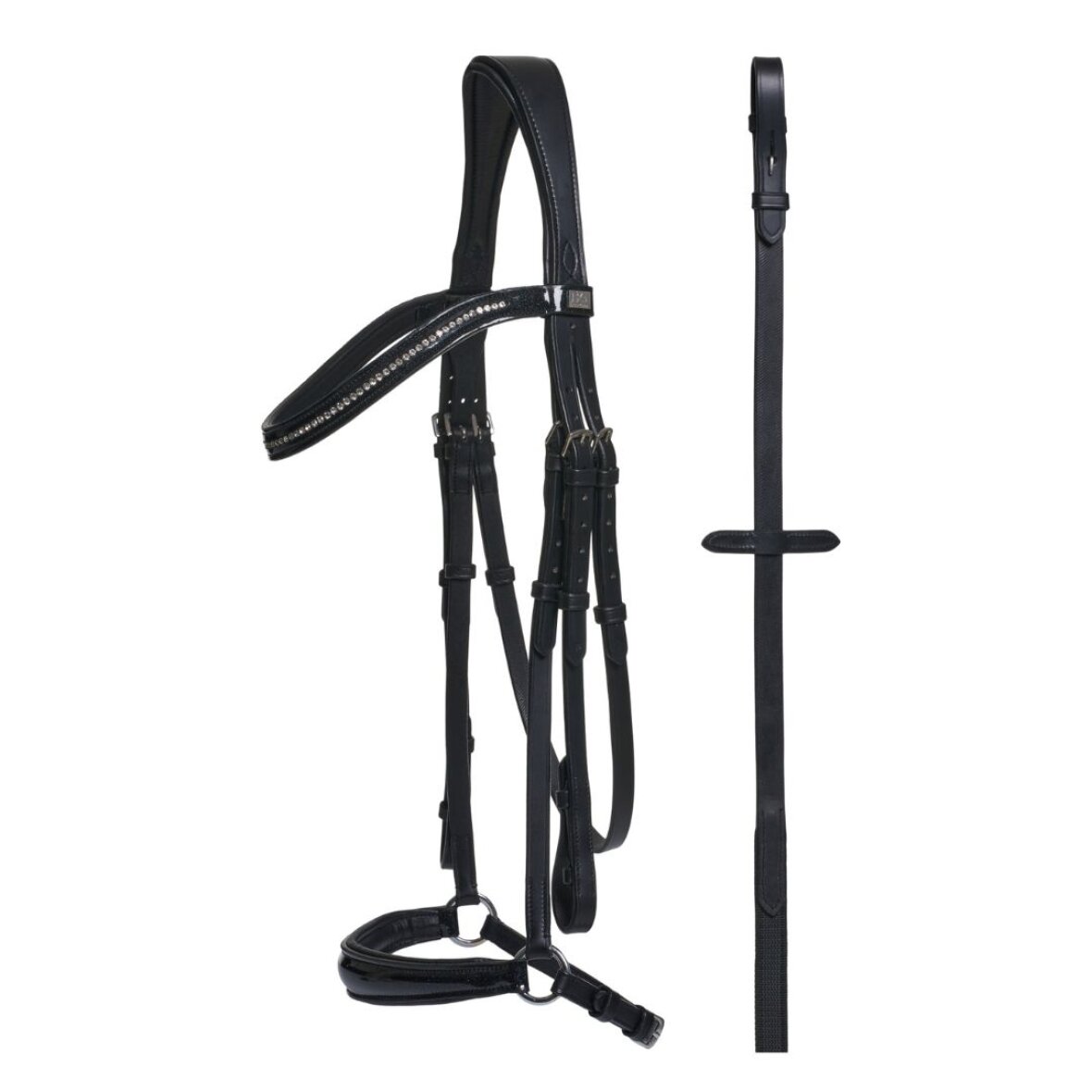 Lak og glimmer læder trense med hannoveransk næsebånd. Denne trense er med anatomiskformet nakkerem med foring og let buet lak pandebånd med krystaller. Hannoveransk næsebånd med lak og polstring. Der medfølger 16 mm super grip tøjler.