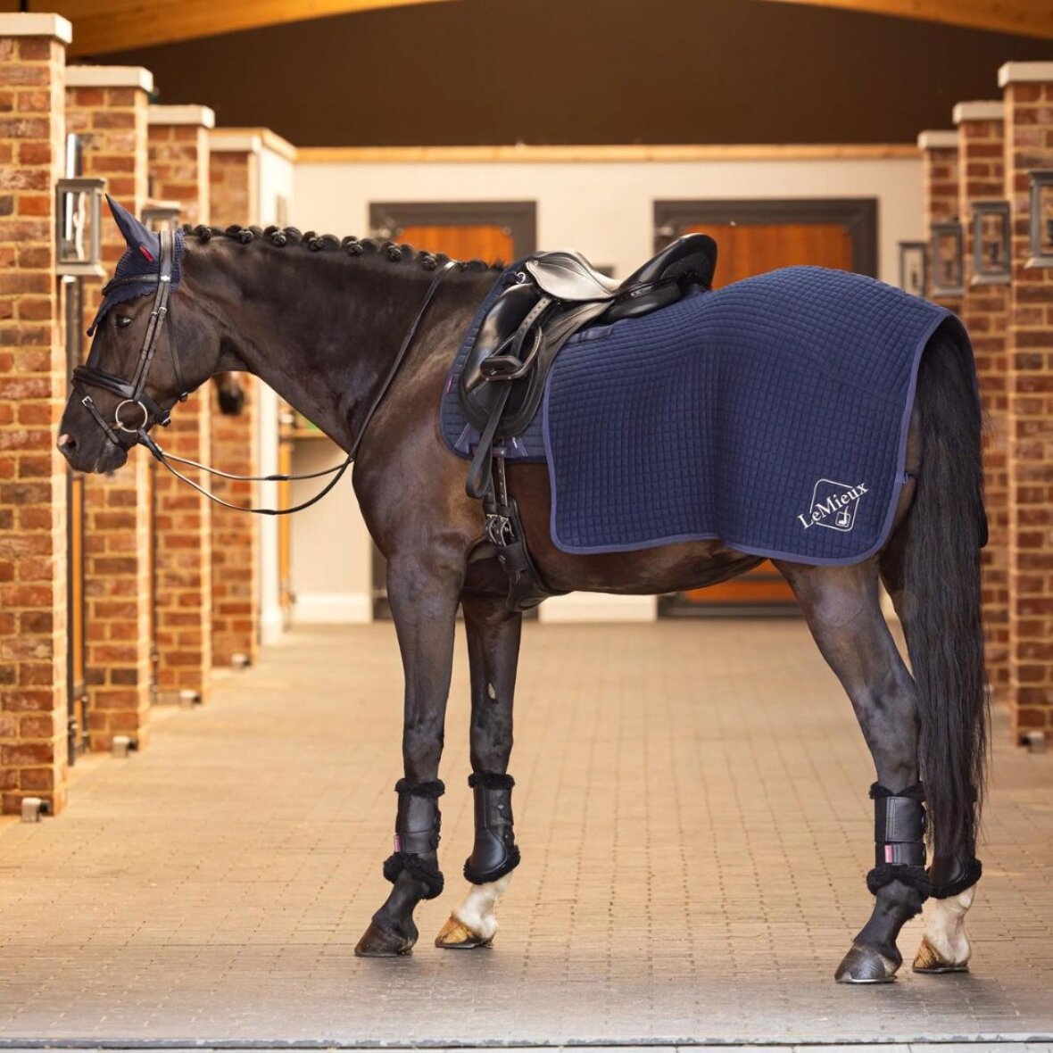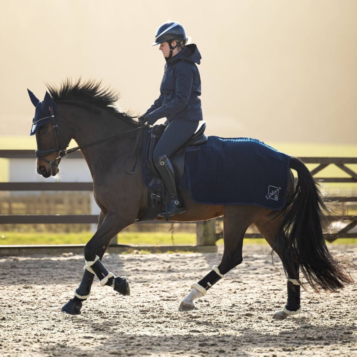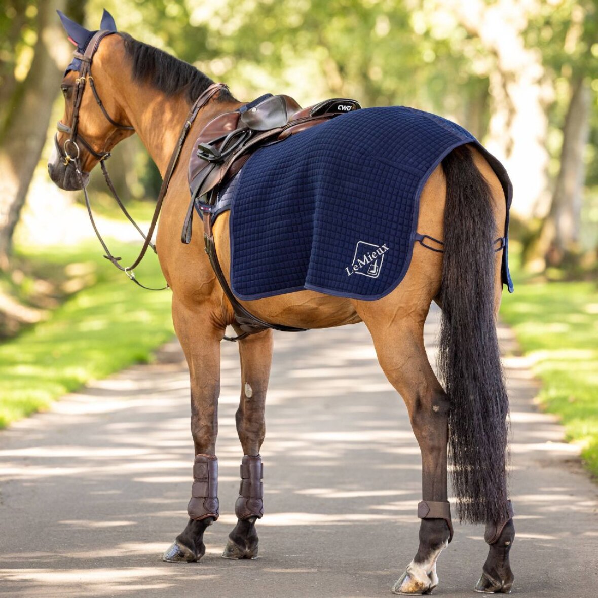 Lækkert og funktionelt quiltet flerelags lændedækken fra LeMieux. Ideelt som ridedækken da materialet holder hestens bagpart varm og transporterer overskydende varme og sved væk. Dækkenet har velcrolukninger fortil, som kan spændes fast i sadlen og en halesnor, så dækkenet holdes på plads under ridning. LeMieux broderet logo på den ene side.