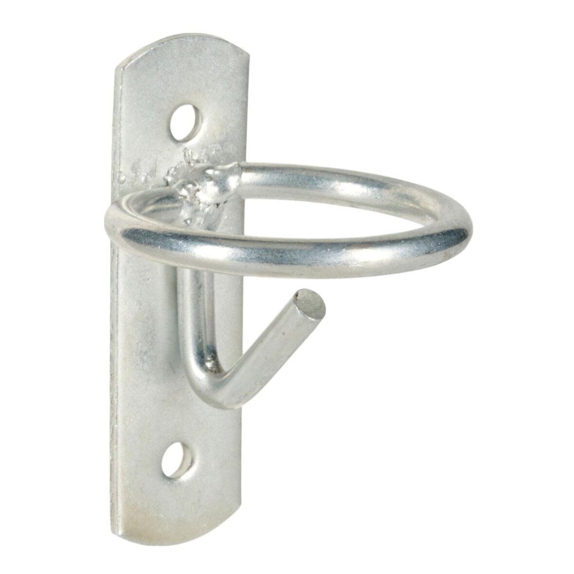 Spandekrog fra HorseGuard. Ringlåsesystemet forhindrer, at spanden hopper af, når spanden er tom eller når hesten keder sig eller bare er legesyg. Afrundede metalkanter som forhindre skader på hestens hoved, især øjne og mund. Spandekrogen fastgøres til væggen via en stor dobbelt skrueplade.