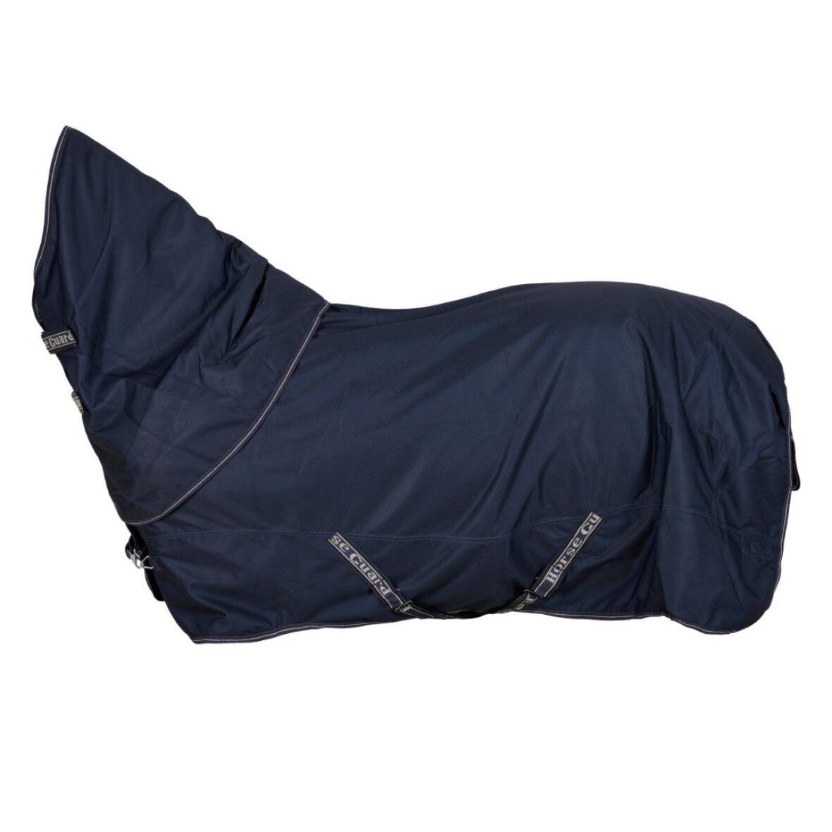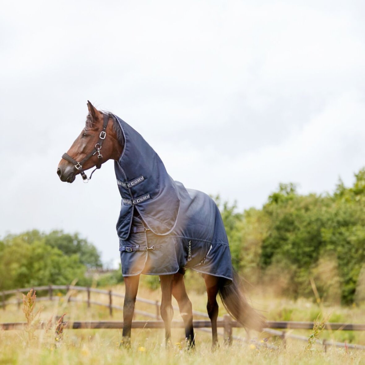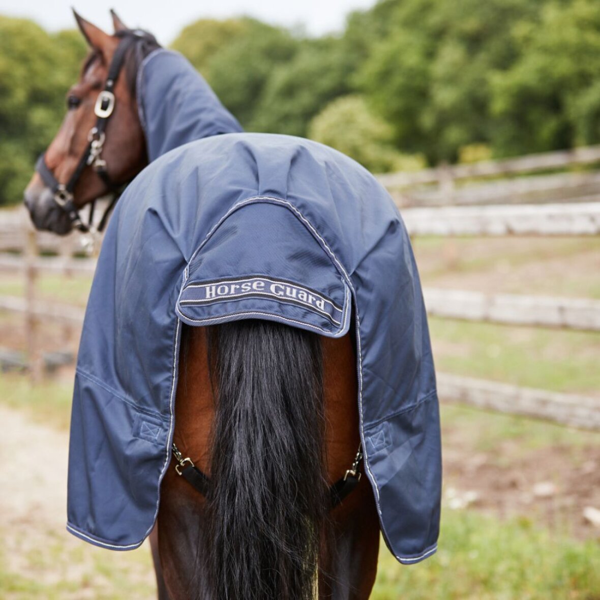 Overgangsdækken med aftagelig hals og 100 g fyld fra HorseGuard. Dækkenet er fremstillet i 1200 D rivfast ydre, som også er vand- og vindtæt. Justerbare mave- og bagbensstropper. Stor haleklap og nemme justerbare spænder ved bringen. HorseGuard logo skrift på alle stropper.