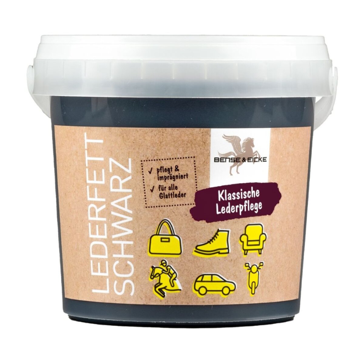 Sort læderfedt fra Bense & Eicke. Denne læderfedt er med vaseline som gør læderet smidigt, blødt og vandafvisende. Læderfedt forlænger læderets levetid og denne tilføjer den sorte farvet til læderet.