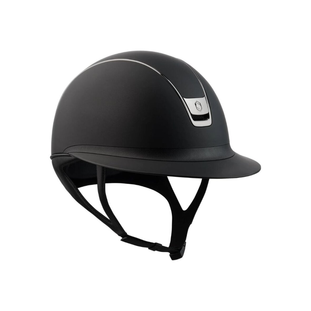 Smuk standard Miss Shield 2.0 samshield ridehjelm i sort shadowmatt med sort top og frontal bånd, trimmen er black chrome. Hjelmen er med den nye EN1384:2023 godkendelse. Miss Shield 2.0 ridehjelmen har en mere oval pasform som gør at den kommer længere ned på hoved og om nakken. Miss Shield 2.0 har også fået et opgraderet luftindtag foran, som giver enestående ventilation, samt ridehjelmen har ingen direkte tryk på panden, så man undgår sved og hovedpine.
