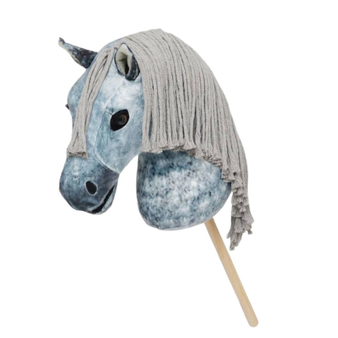 Smuk skimmel kæphest fra LeMieux. Denne kæphest hedder Sam og er med grå man og hale som kan flettes. Kæphesten har åben mund og er med velcro så den kan holde biddet på plads i munden.