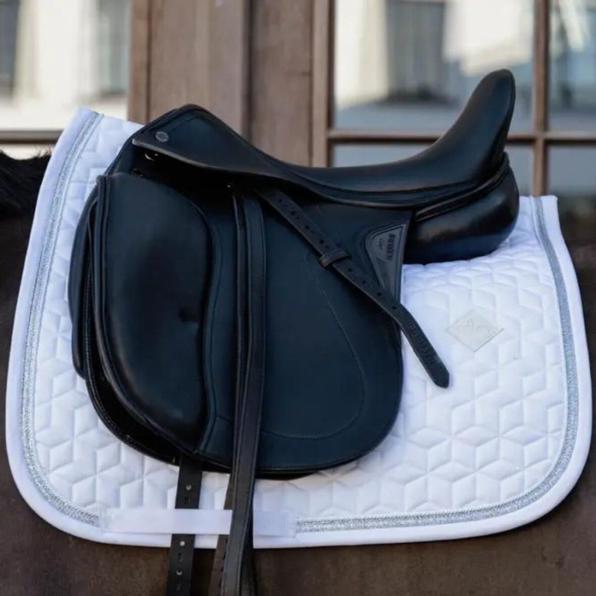 Dette dressur stævne underlag fra Kentucky Horsewear er med sølv glitter kant og et unikt stjerne quiltning. Underlaget har kun en nylonstrop til gjorden til fastgørelse så man slipper for irriterende stropper. Underlaget er fremstillet i åndbart og hurtigtørrende materiale.