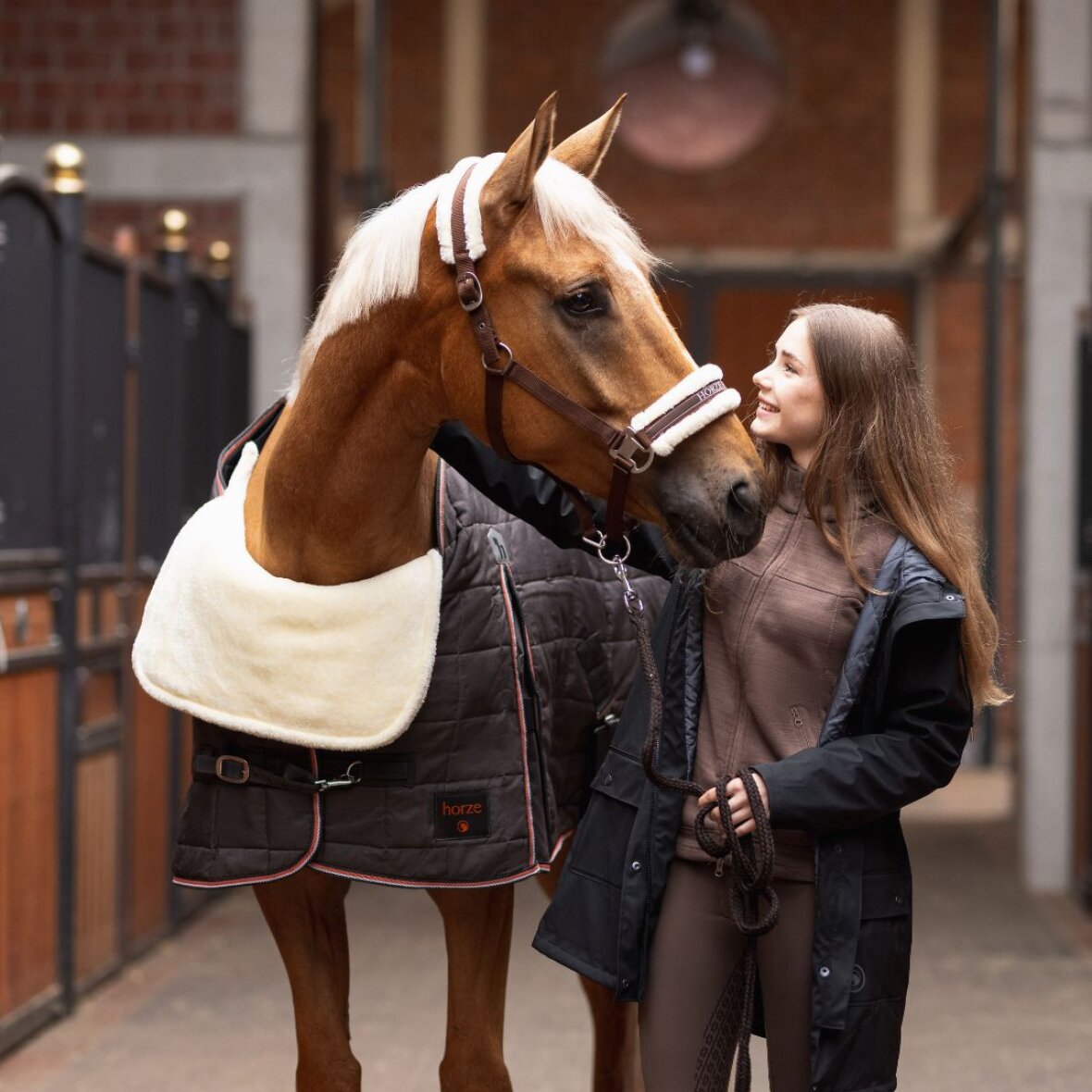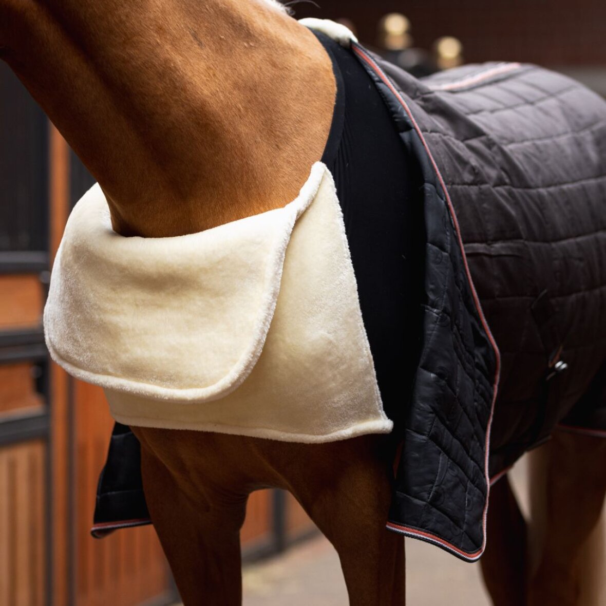Dækkenundertrøje fra Horze. Denne undertrøje er med imiteret lammeskind som giver hesten ekstra komfort og beskyttelse. Dækkenundertrøjen er åndbar og giver god beskyttelse til hestens skulder fra slid af dækkener. Den spændes bag forbenen med click spænde.