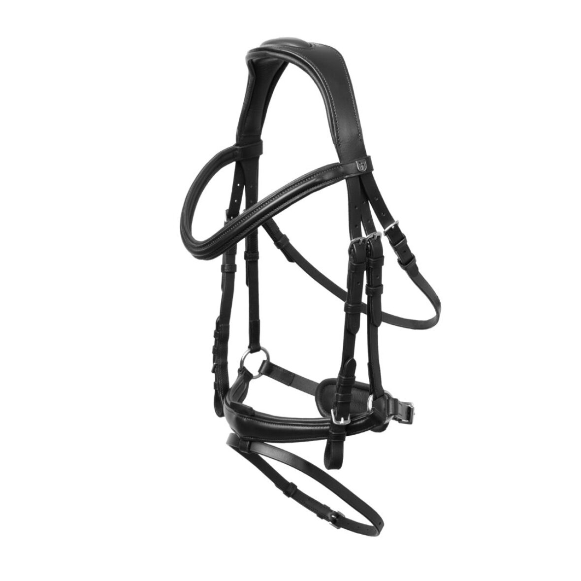 Sort læder trense fra Horze. Denne trense er med anatomisk formet nakkerem med blød foring. Enkel og elegant pandebånd. Foret næsebånd, hvor det yderste næsebånd er aftageligt. Trensen er med sølvfarvet metal spænder.