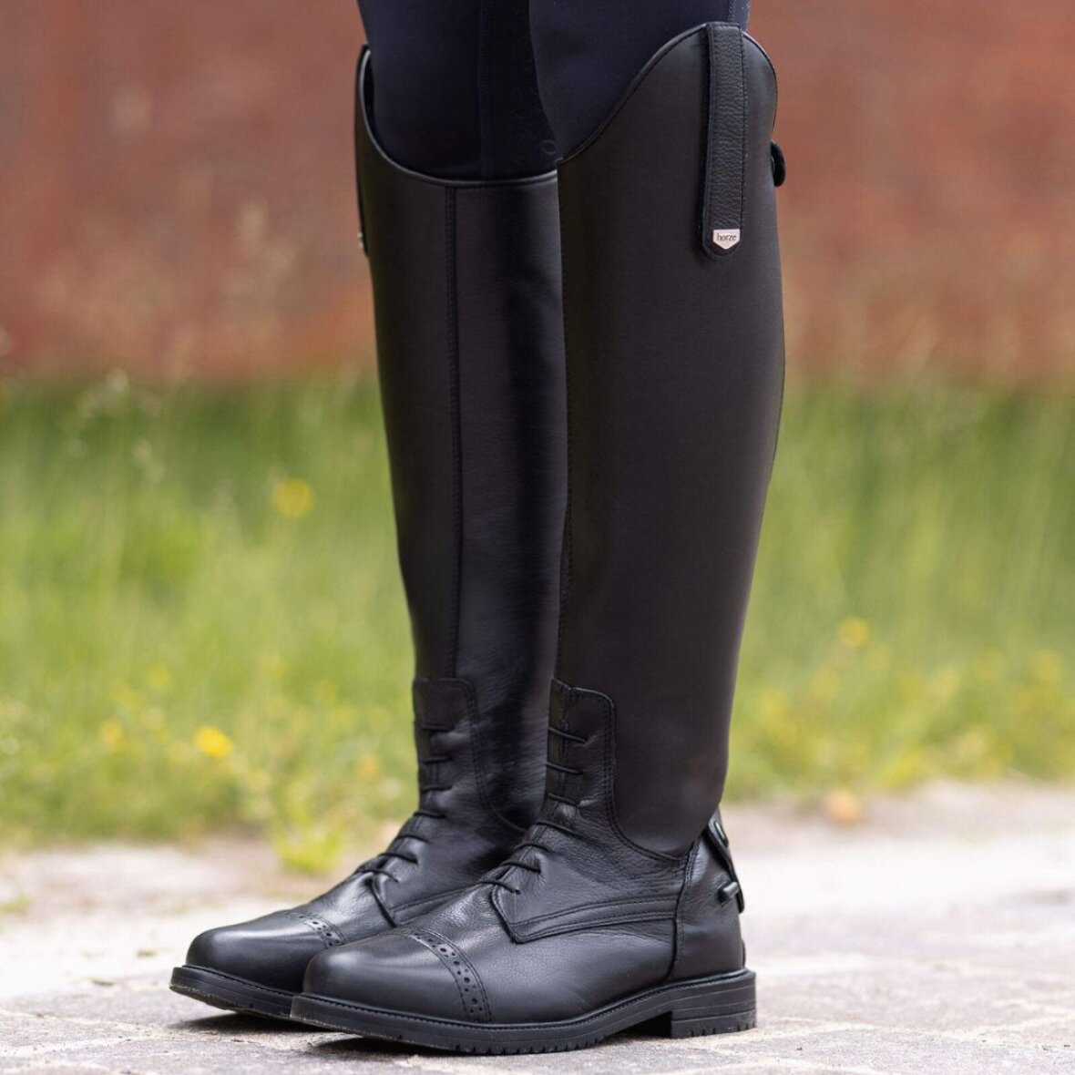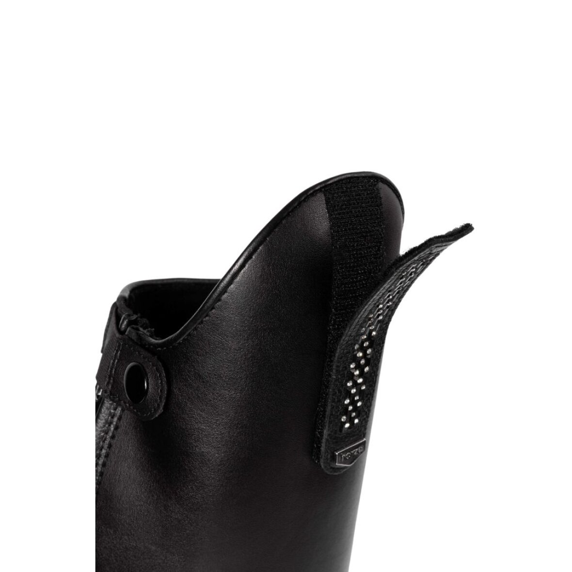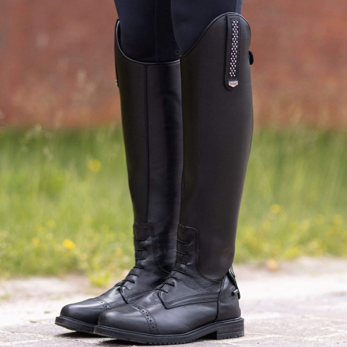Flotte lange ridestøvler fra Horze. Disse ridestøvler er fremstillet i PU-læder som er et kunststof og er derfor nemme at vedligeholde. De er med elastik snøre og har hul mønster ved tåen. Ridestøvlen lukkes med YKK lynlås bagpå. Toppen er med krystaller som er påsat en velcro, denne kan udskiftes, så ridestøvlen bare er helt sort (se billeder) Skridsikker gummisål med ridehæl.