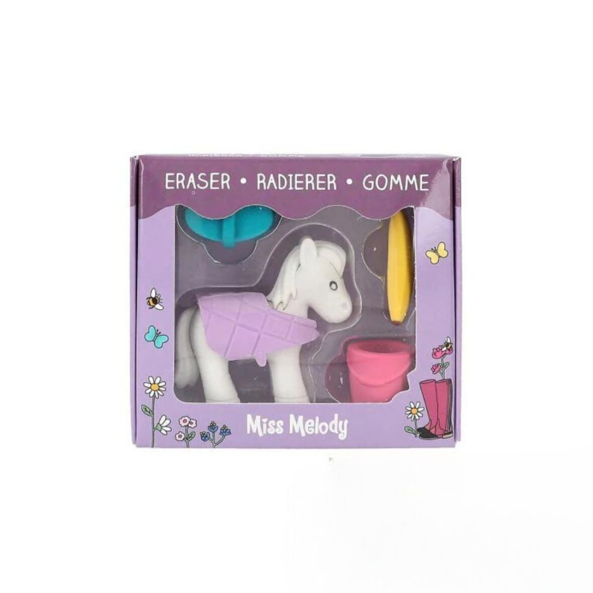 Lille viskelæder sæt fra Miss Melody. Sætte består af en hvid hest med dækken, spand, børste og en banan. Perfekt til skoleopstart.
