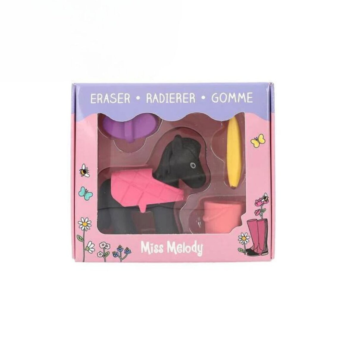 Lille viskelæder sæt fra Miss Melody. Sætte består af en sort hest med dækken, spand, børste og en banan. Perfekt til skoleopstart.