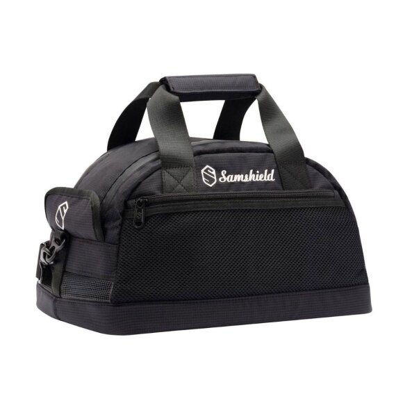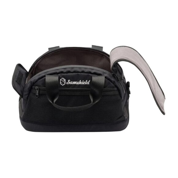 Kvalitets ridehjelmstaske fra Samshield. Denne ridehjelmstaske er fremstillet i solidt nylon med lufthuller i kant forneden. Den er med 2 robuste håndtag og en justerbar skulderrem. Ridehjelmstasken er foret indvendig, så din ridehjelm ikke får ridser og skrammer. Den er med 2 lynlåslommer for og bag til diverse ekstra ting.
