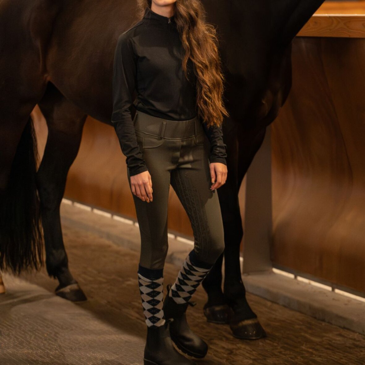 Ridetights fra Equipage med høj talje. Disse ridetights er med fuld silikone grip og bred elastik linning med bæltestropper. De er med børstet inderside, så man kan holde varmen. De er fremstillet i slidstærkt og åndbart materiale.
