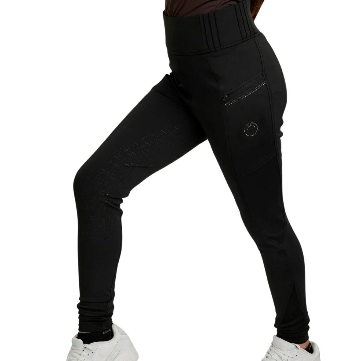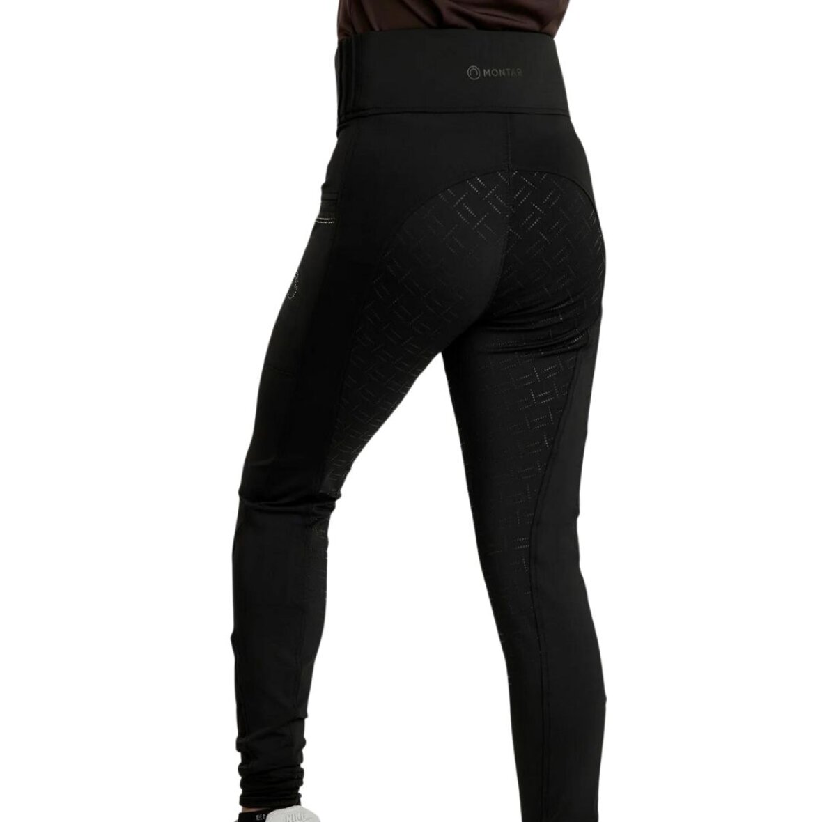 Ridestights fra Montar. Disse ridetights er med fuld silikone grip og har en høj, bred støttende talje med bæltestropper. De er med telefonlommer på begge lår som lukkes med lynlås og har fine dekorative krystaller. Montar logo på den ene lommer.