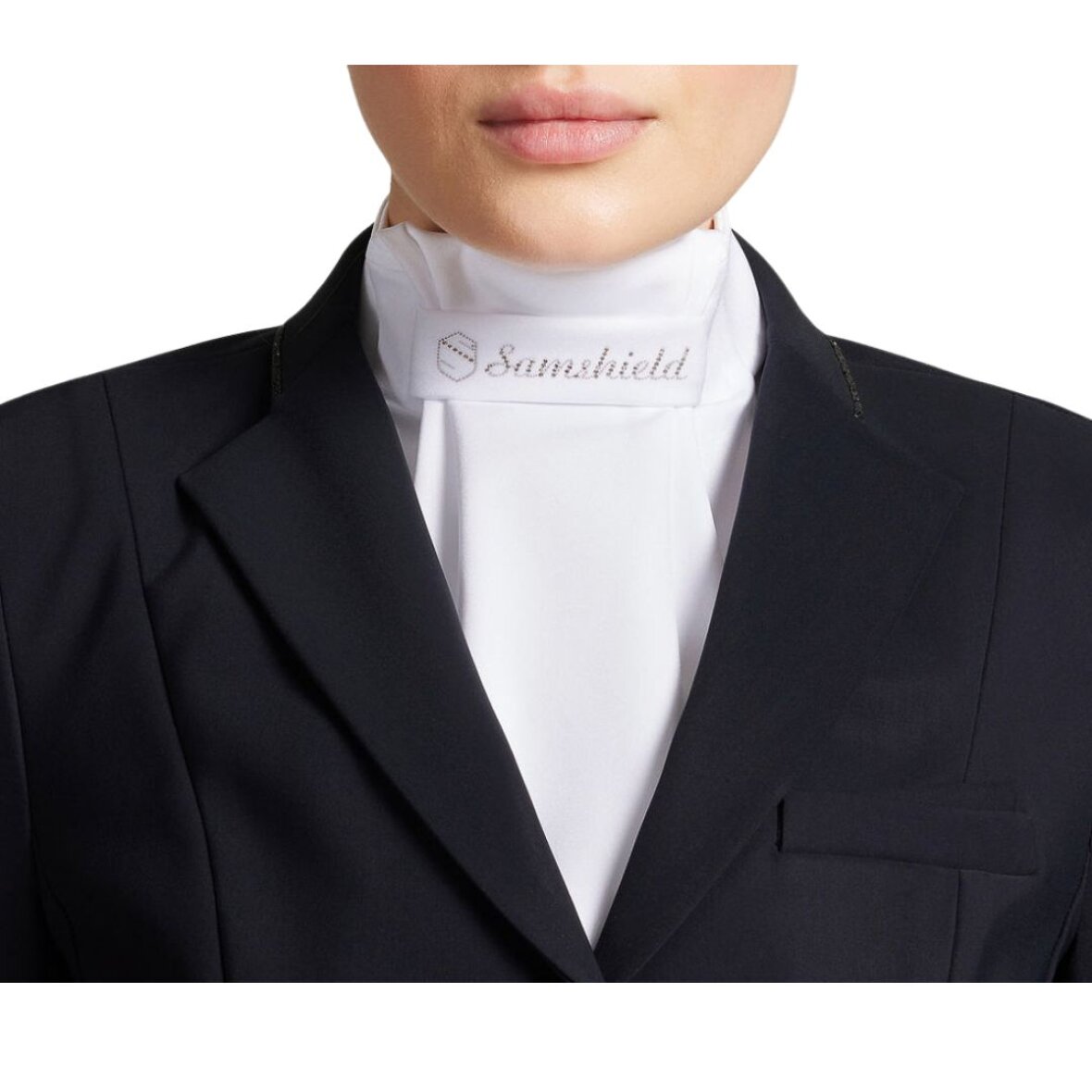 Elegant hvid plastron med Samshield logo i glimmer øverst. Samshield logo broderet forneden i sølv. Den lukkes i nakken med velcro.