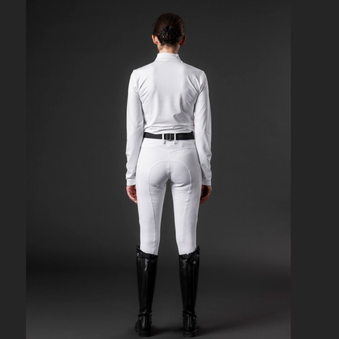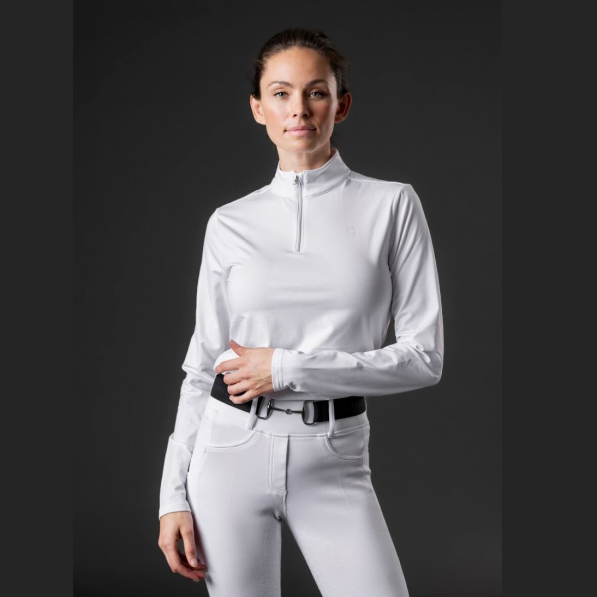 Stævnebluse fra Equipage med lange ærmer og høj krave og har børstet inderside. Blusen er åndbar og hurtigtørrende samt lukkes med halv lynlås i halsen. Equipage logo på det ene bryst.