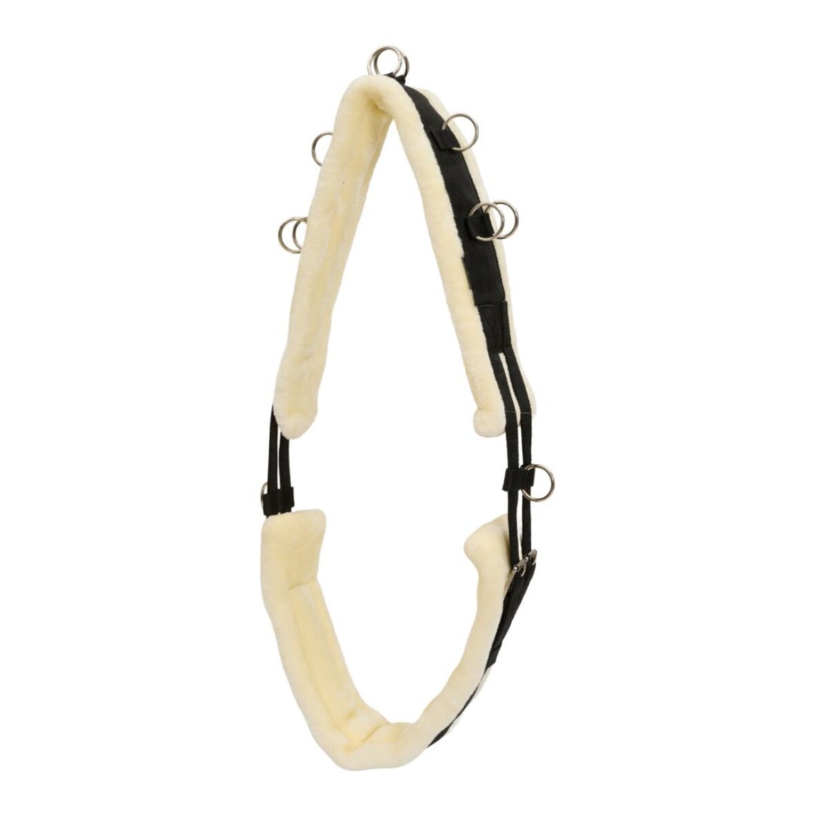 Longeringsgjord med imiteret lammeskind fra HorseGuard. Denne longeringsgjord kan spændes op i begge sider og er med 10 ringe til diverse.
