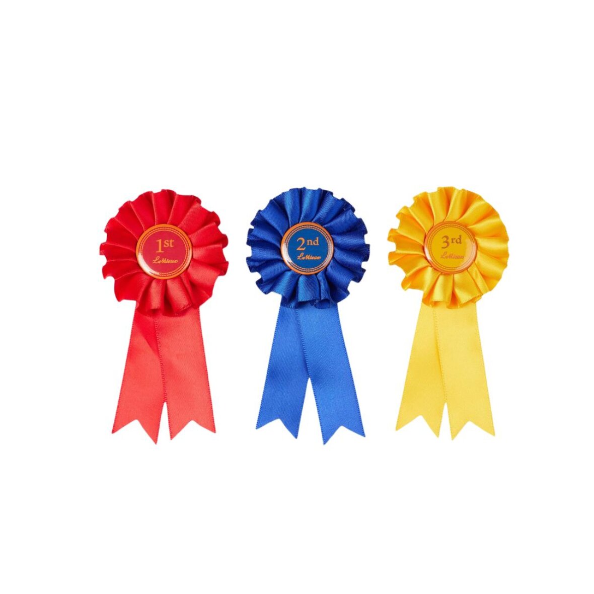 3-pak rosetter som paaser til mini toy ponyerne fra LeMieux. Disse 3 rosetter er i farven rød, blå og gul.