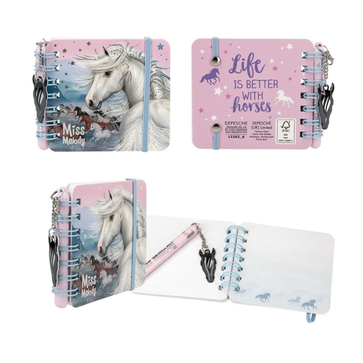 Lille sød notesbog med kuglepen. Denne lille notesbog er med det fineste hestmotiv på forsiden. Der medfølger en fin kuglepen med hestmotiv og i toppen er der vedhæftet et hestehoved.