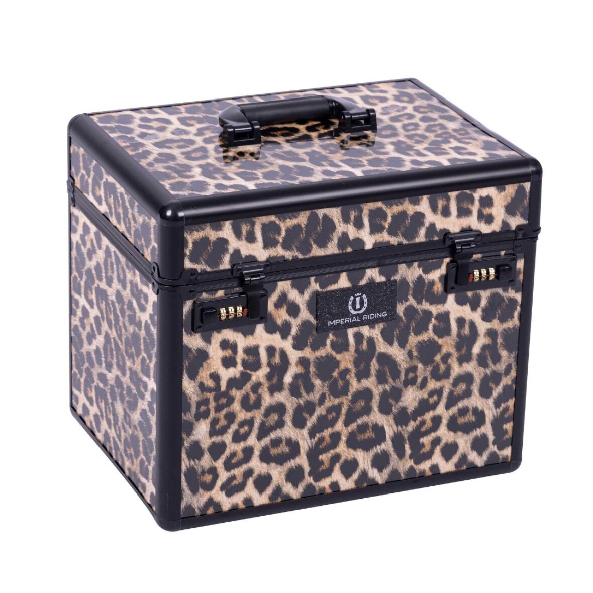 Striglekassen med leopard motiv fra Imperial Riding. Denne perfekte striglekasse til at opbevare alt dit plejeudstyr og tilbehør. Indlægget i denne box er lavet af et blødt materiale for at beskytte dine genstande, og rumdelerne kan justeres for at organisere dine ting. En mindre bakke rummer mindre genstande såsom godbidder og man elastikker, og et spejl i låget giver dig mulighed for at få et hurtigt stiltjek, inden du tager afsted på din tur. For at holde det hele sikkert kan denne striglekasse låses med to kombinationslåse.