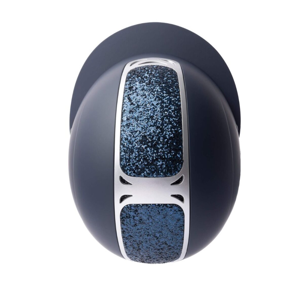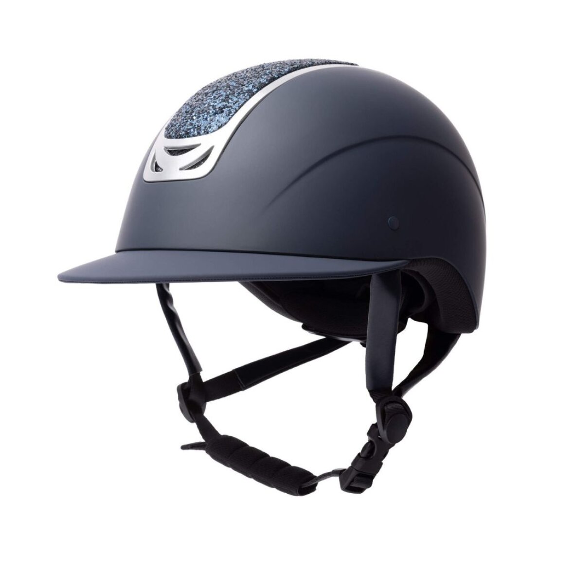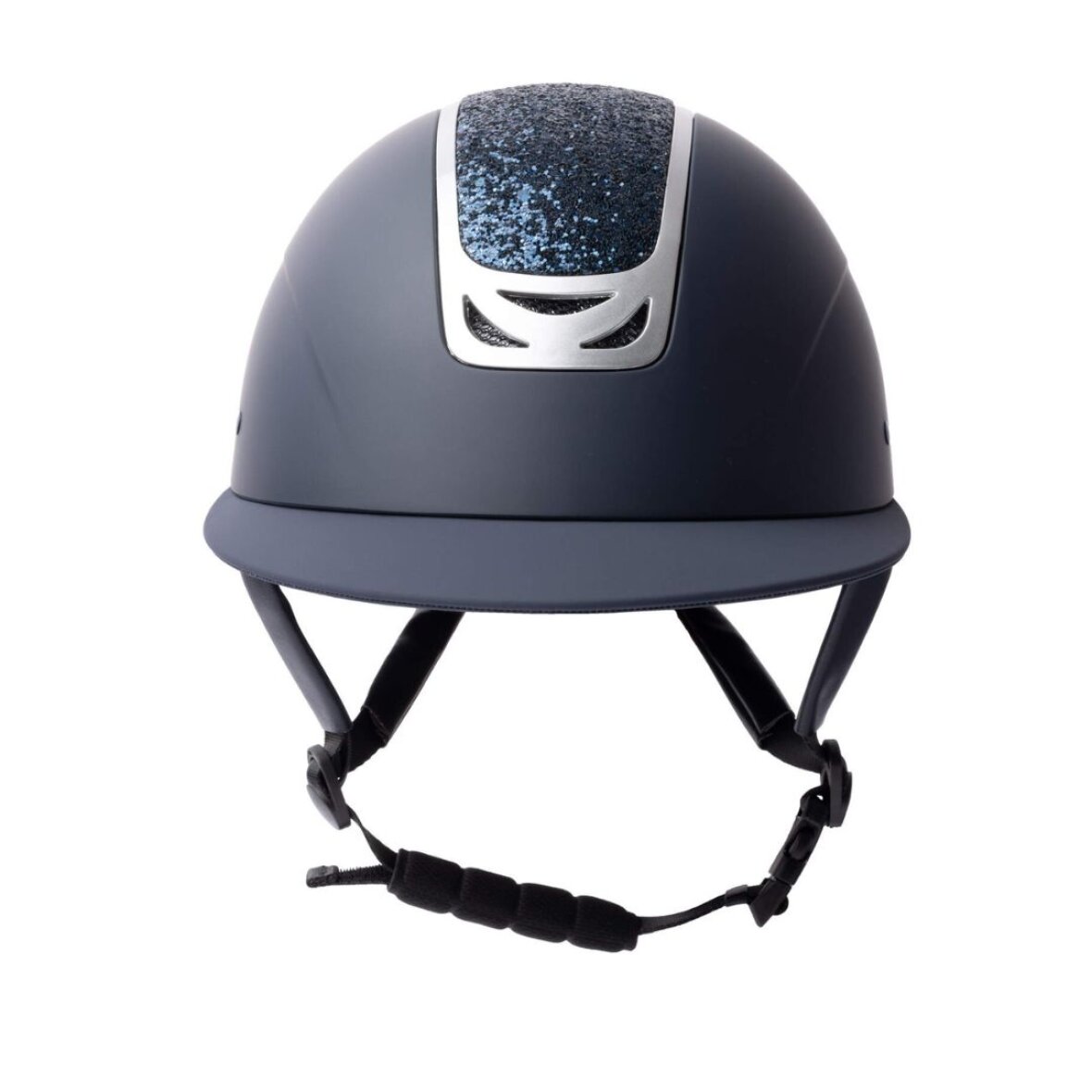 Ridehjelm fra Horze. Denne ridehjelm er i farven navy med en flot top af blå krystaller og har gode ventilationshuller. Ridehjelmen indstilles i størrelse i nakken på skrueknappe. Den har bred skygge og aftagelig og vaskbar liner.