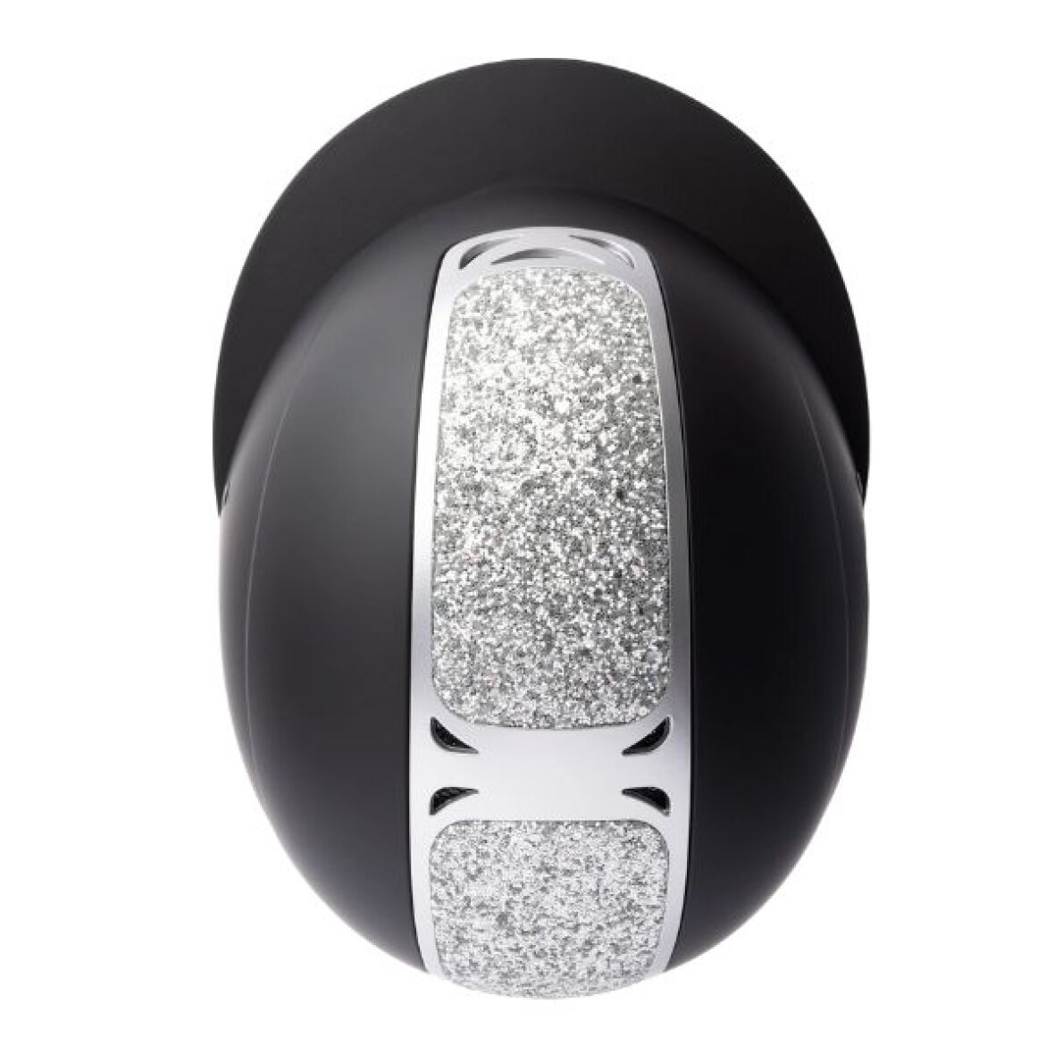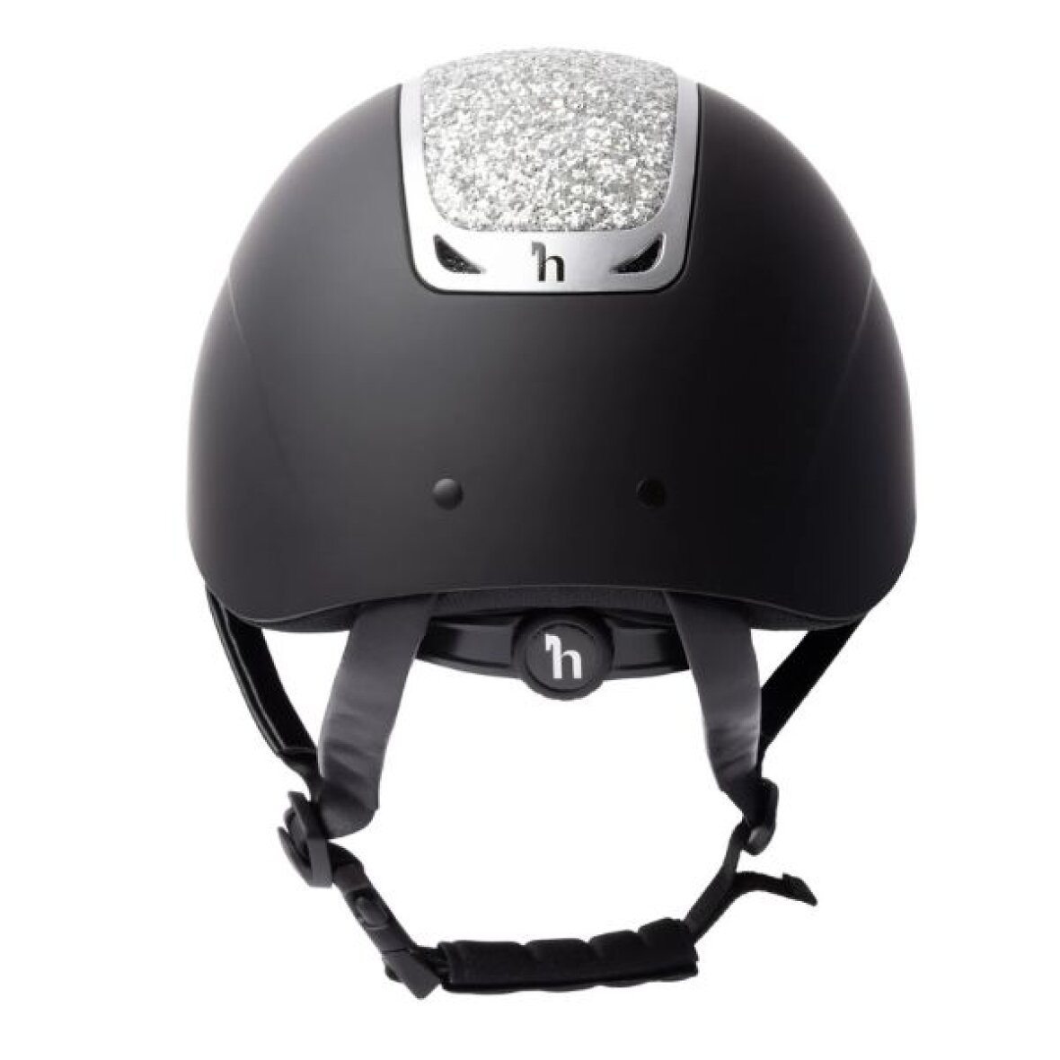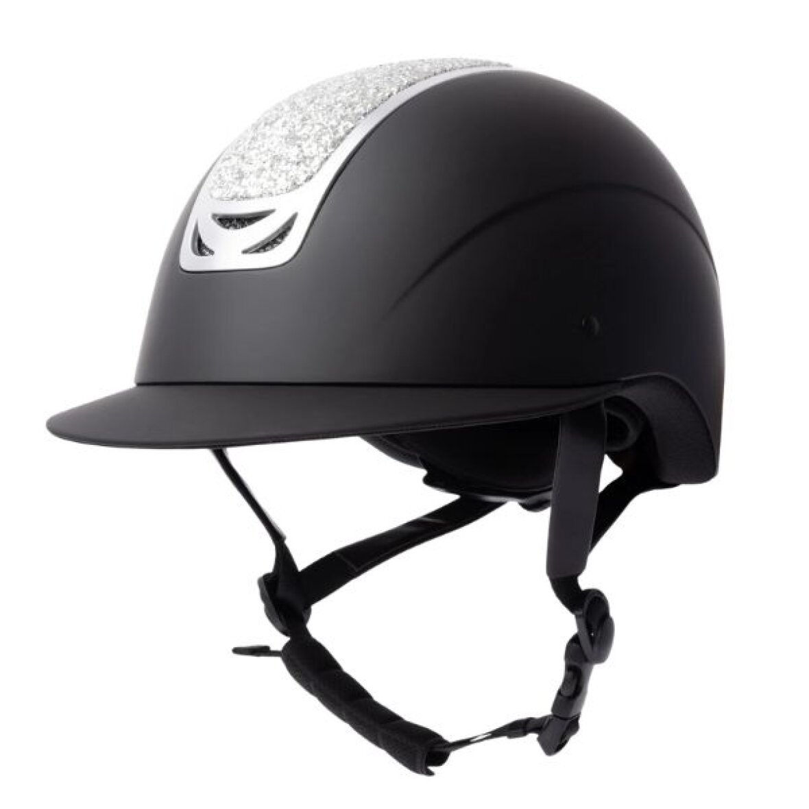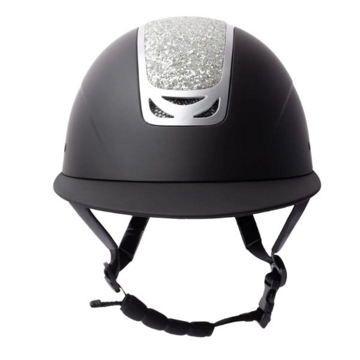Ridehjelm fra Horze. Denne ridehjelm er med en flot top af sølv farvet krystaller og har gode ventilationshuller. Ridehjelmen indstilles i størrelse i nakken på skrueknappe. Den har bred skygge og aftagelig og vaskbar liner.