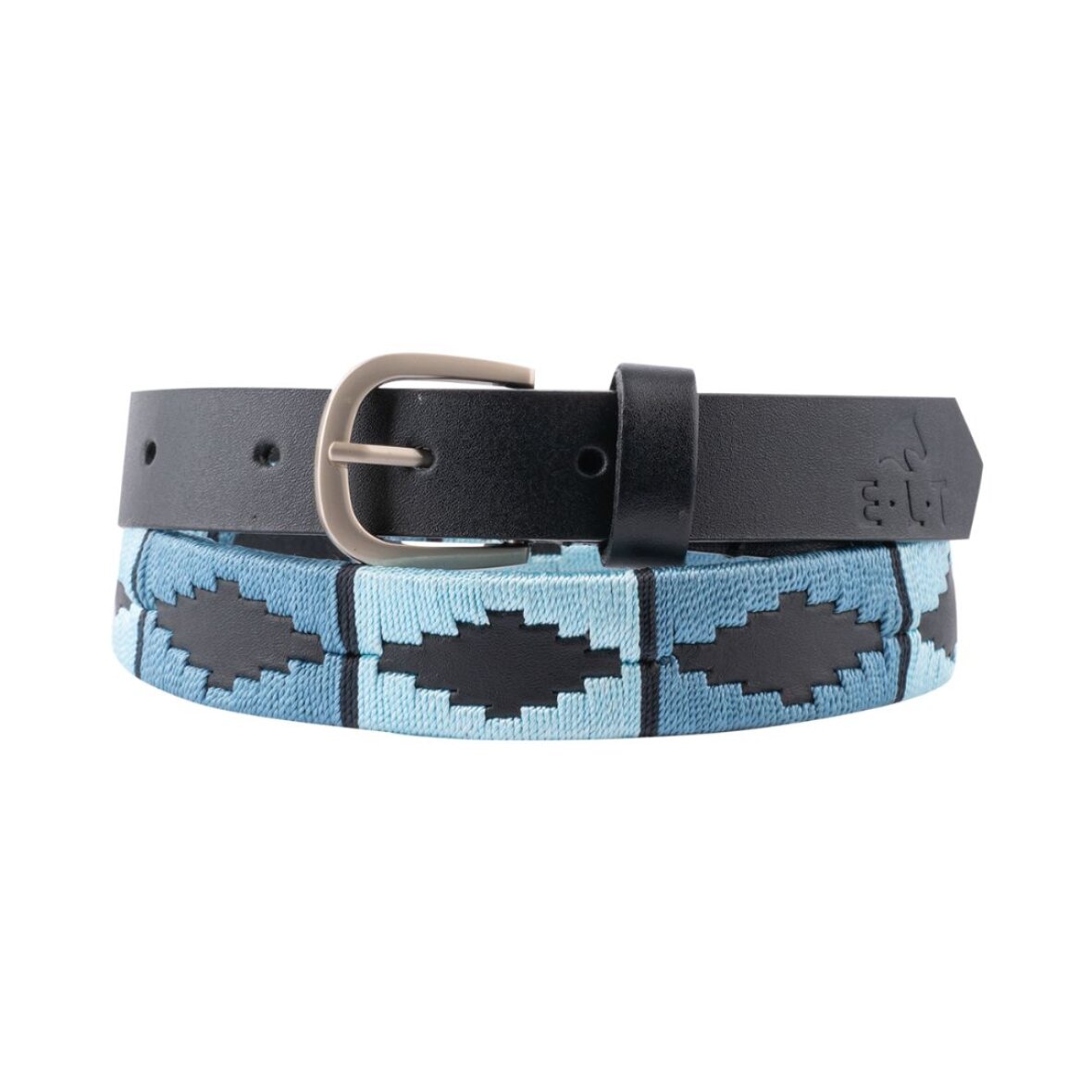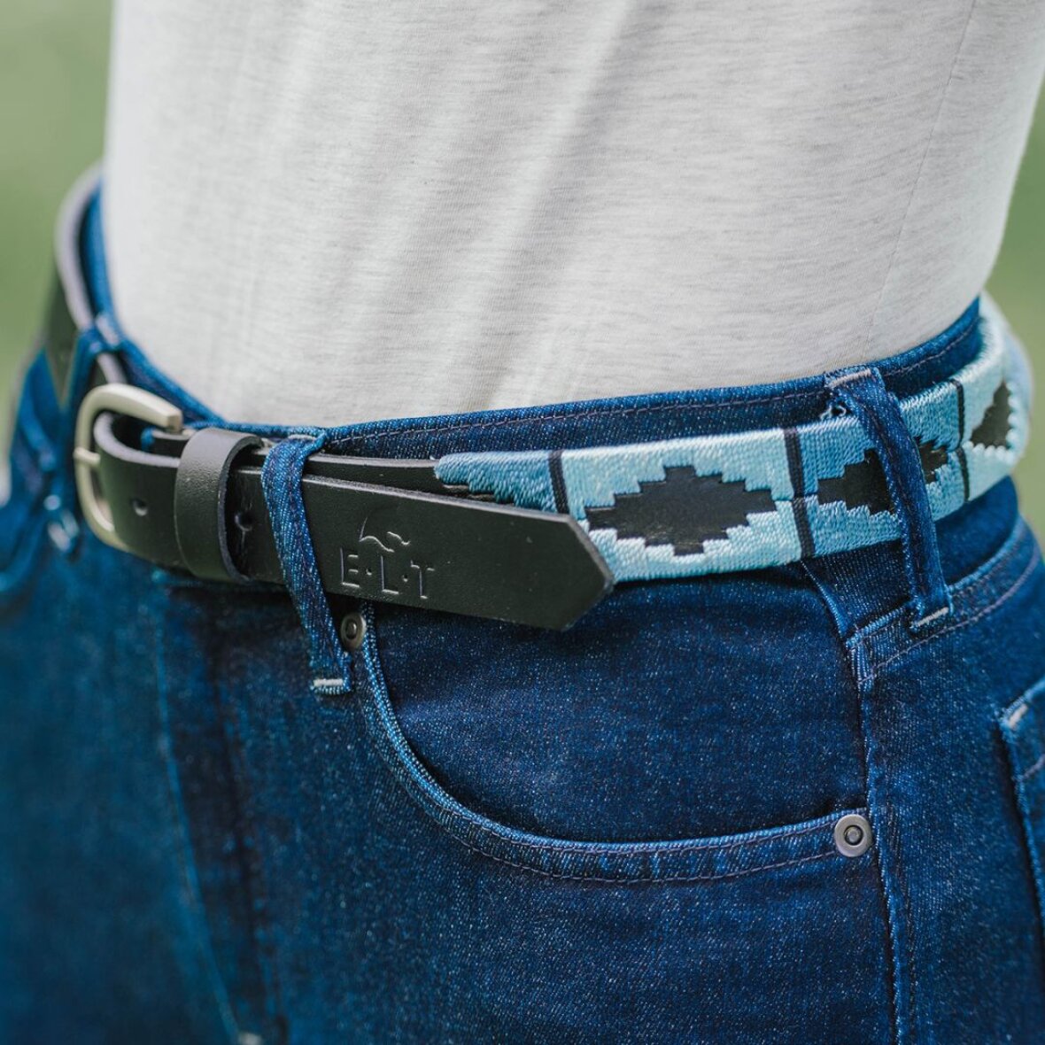 Læder bælte med oversyet tråd i blå toner med sort mellem streger. Bæltet er med metal spænde og har en bredde på 3 cm. ELT logo præget i enden af bæltet.