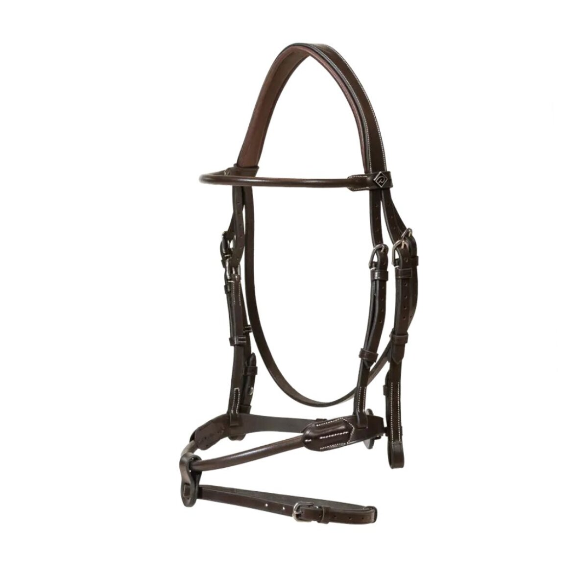 Lækker trense fra Dyon. Denne trense er med anatomiskformet nakkerem og polstring. Enkel og smalt rundsyet pandebånd med Dyon logo i den ene side. Trensens næsebånd er rundsyet med aftagelig yderst næsebånd. Trensen er brun med metal farvet spænder og har hvide syninger.