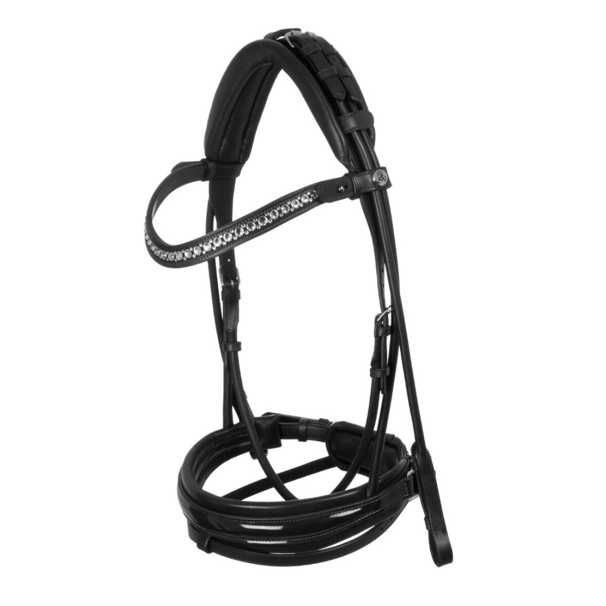 Flot rundsyet trense fra Acavallo. Denne trense er med bred anatomisk formet nakkerem med tyk polstring. Bredt næsebånd med tilbagetræk, lak og blød foring. Let buet pandebånd med smart lukning for hurtig påsætning, samt flotte krystaller.