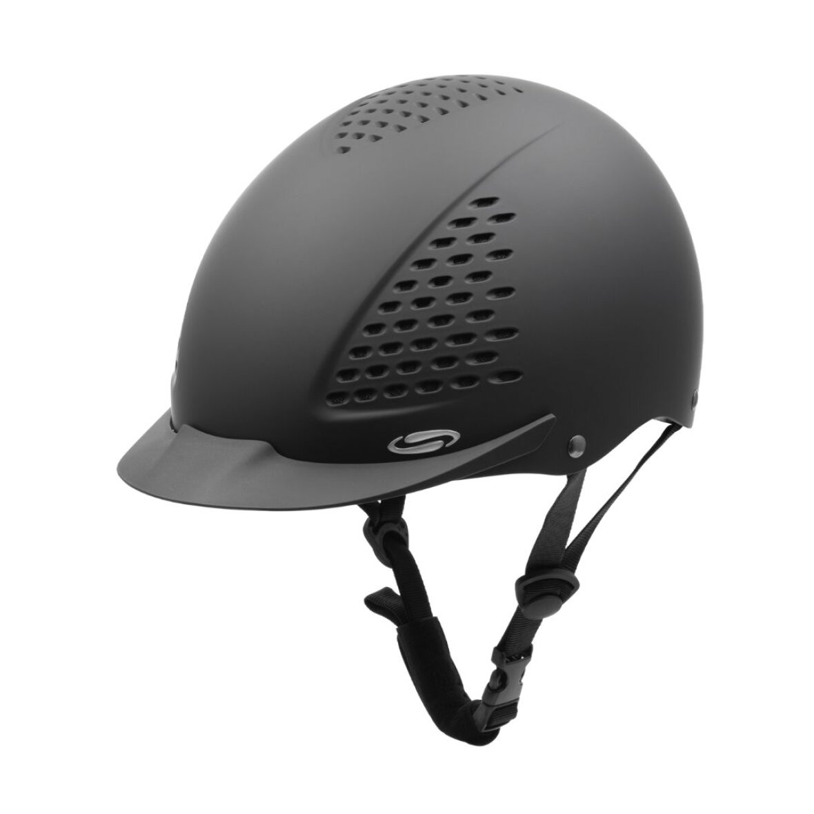 Swing ridehjelm fra Waldhausen. Denne ridehjelm er i mat sort og har gode ventilationshuller i toppen. Den er med aftagelig og vaskbar liner og kan justeres i størrelse på drejeknappe i nakken, samt har justerbar hagerem.