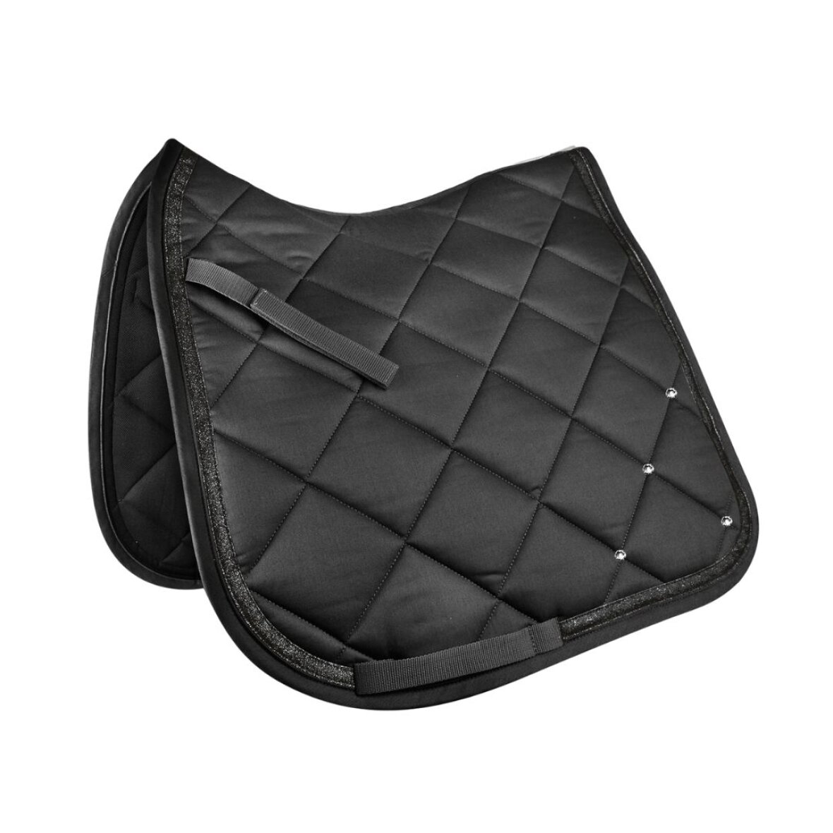 Elegant dressur underlag fra Waldhausen. Dette dressur underlag er fremstillet med en funktionel og åndbar underside som ikke overopheder hesten. Underlaget er med 8 mm tyk skum som giver den helt rigtig trykfordeling til hestens ryg. Flotte krystaller for enden af underlaget samt en flot sort glitter kant hele vejen rundt. Velcrostropper til fastgørelse.