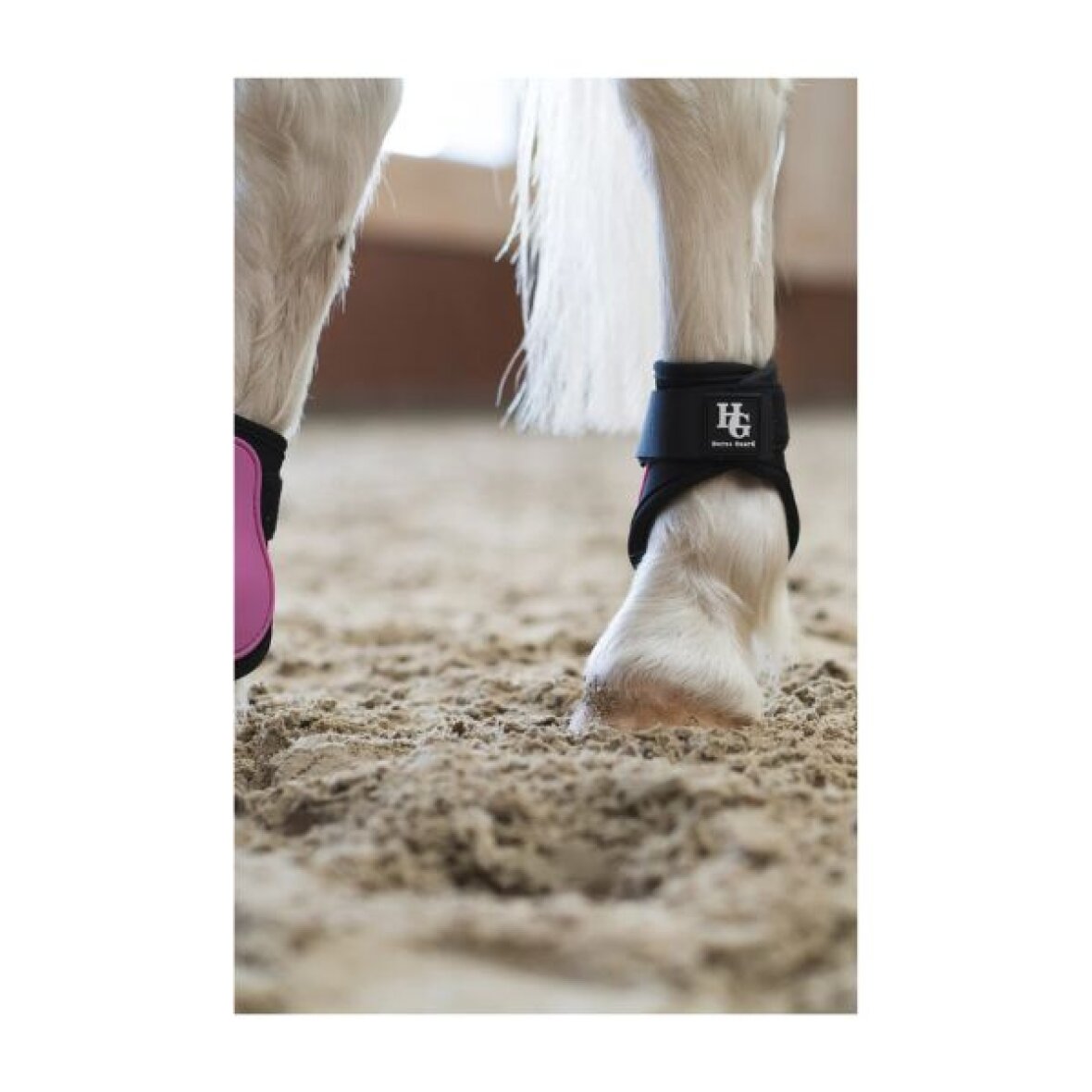 Kodegamacher til beskyttelse af hestens bagben fra HorseGuard. Disse bagbensgamacher har en elastisk strop og velcro lukning for en tæt pasform. Yderskallen er i hård plast med neoprenforing indvendig.