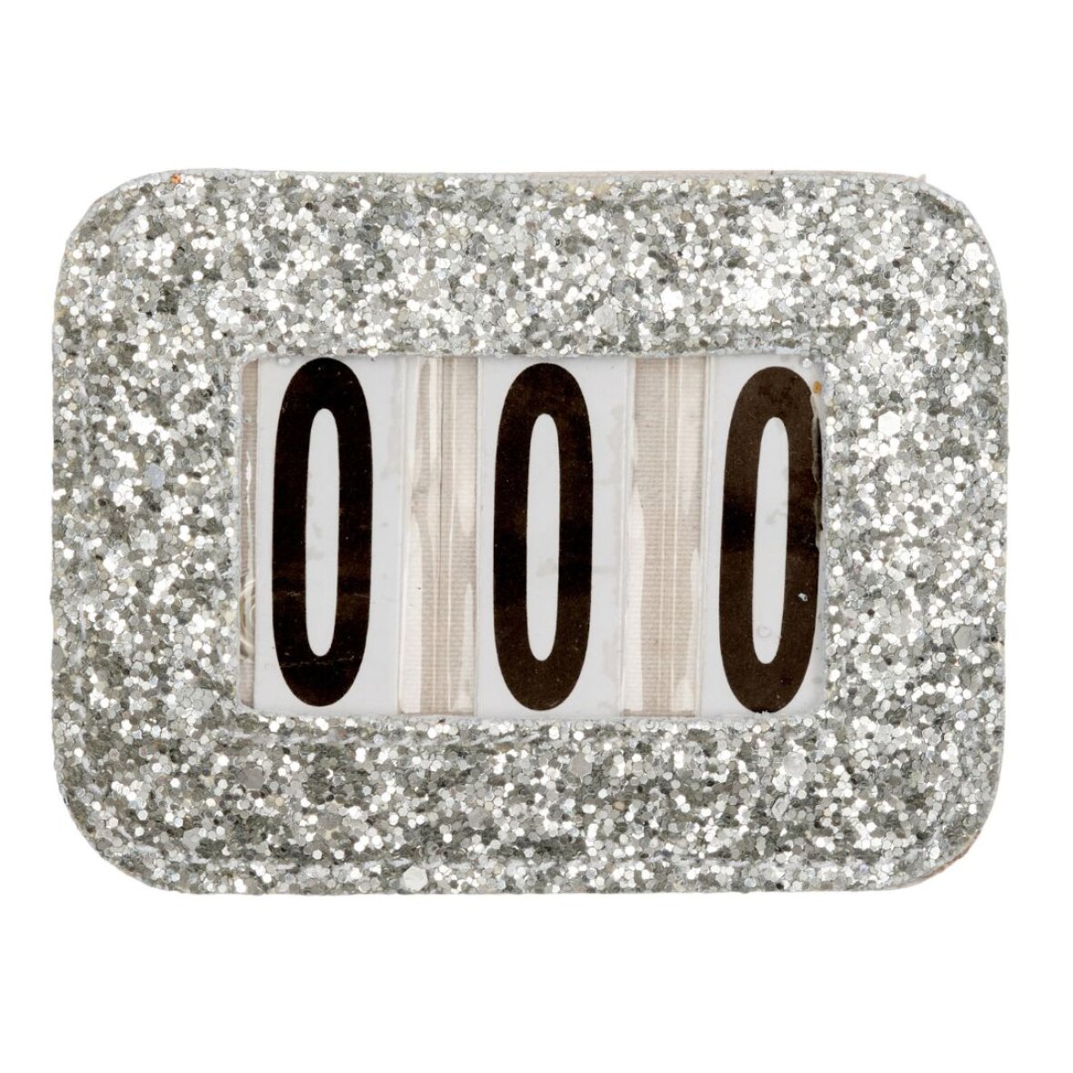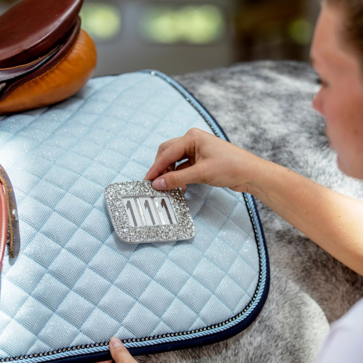 Stævnenummer med 3 tal fra HorseGuard. Dette stævnenummer er med masse flot glimmer rundt om talene, som nemt udskiftes. Der er nål bagpå, så den nemt kan påsættes.