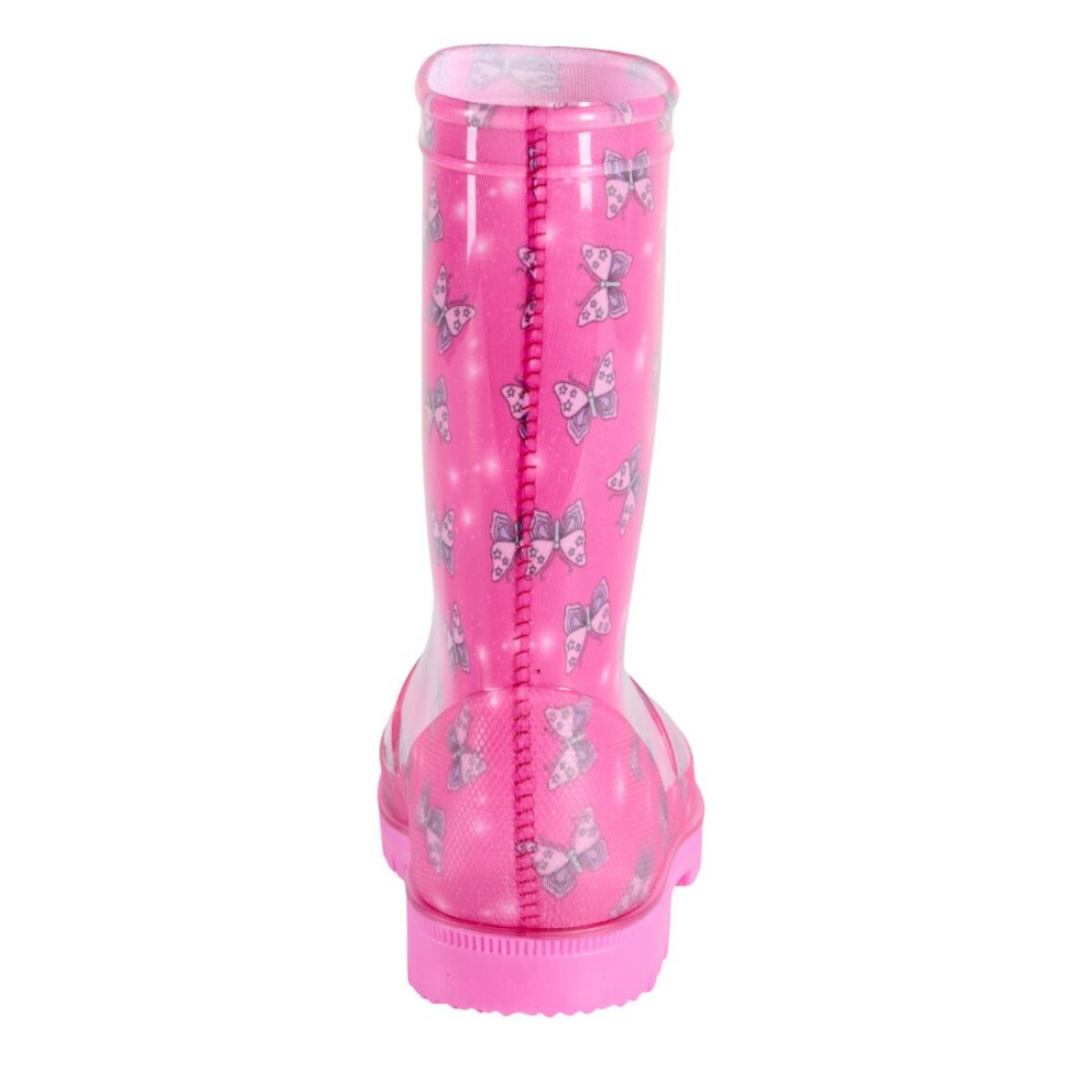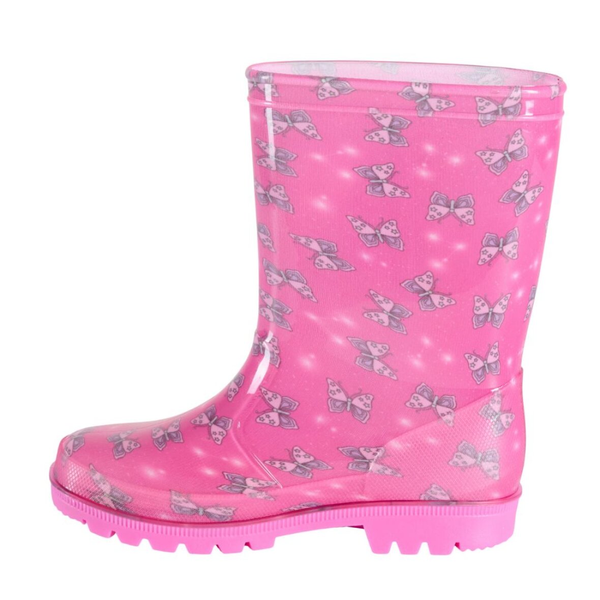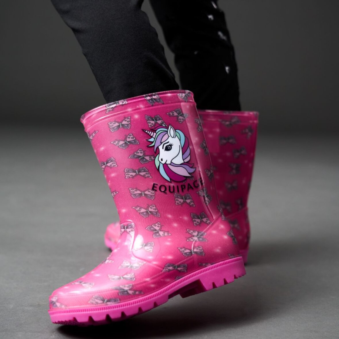 Sødeste børne PVC gummistøvler fra Equipage. Disse gummistøvler er i pink med sødt sommerfugle motiv og en lille unicorn på skaftet. De er med gummisål og grov mønster.