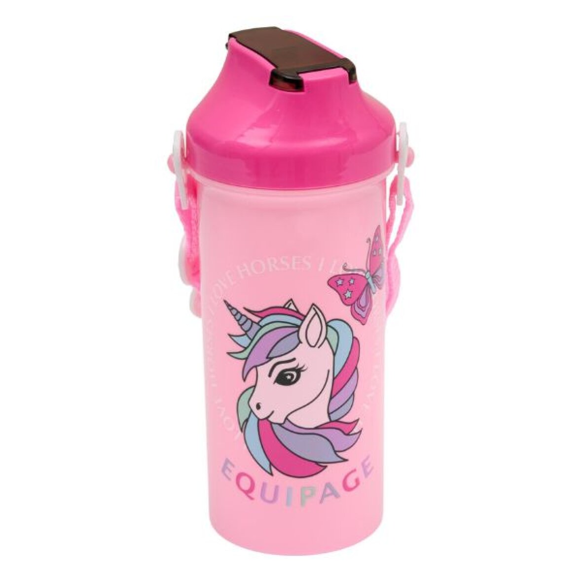Drikkedunk med stort unicorn motiv på fronten. Denne drikkedunk er med sugerør og gummi tut. Der medfølger en nylonrem som kan sættes på drikkedunken så den an bæres om nakken. Kan indeholde 500 ml.