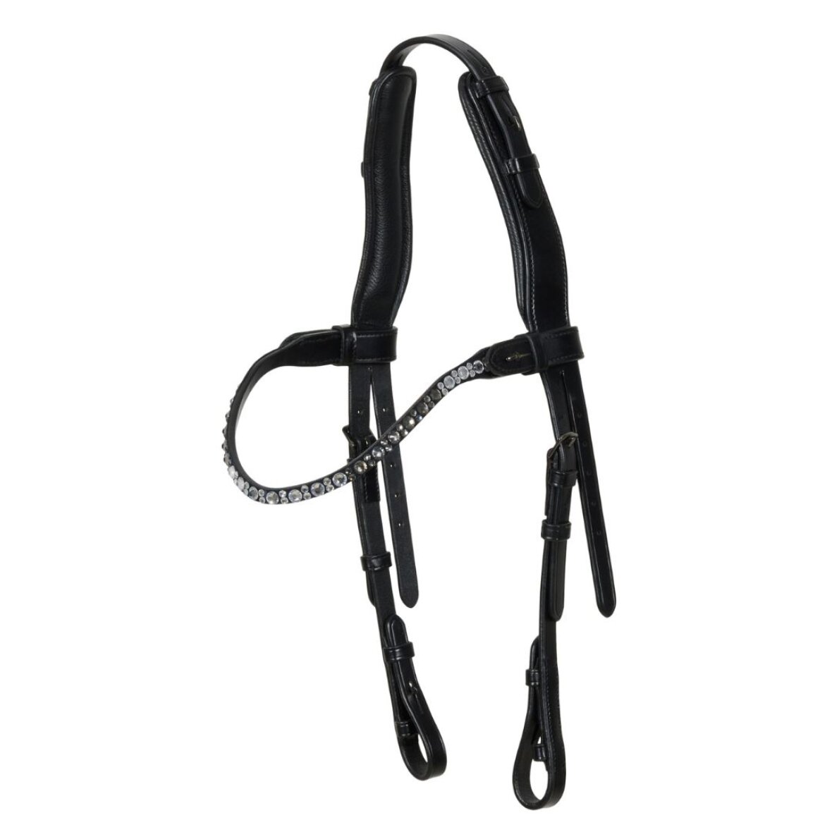 Anatomisk formet løs nakkerem fra Catago. Denne nakkerem er med foring i siderne og tynd rem mellem for at gíve god plads til hestens anatomi. Smalt og let buet pandebånd med krystaller og hurtig lukning. Nakkeremmen er med sorte spænder.
