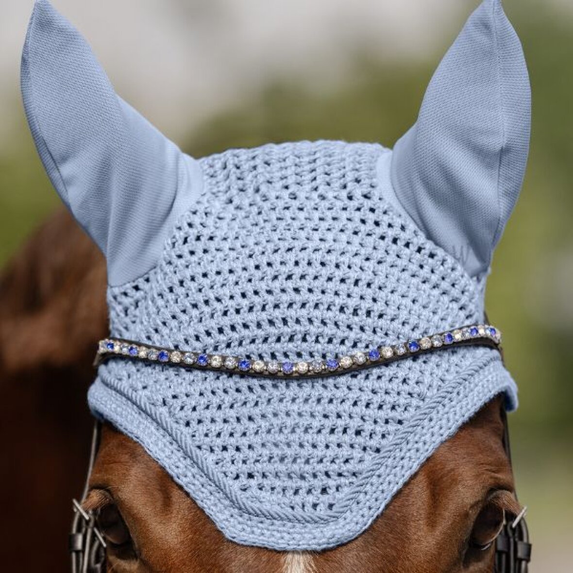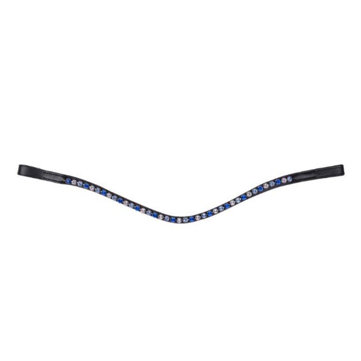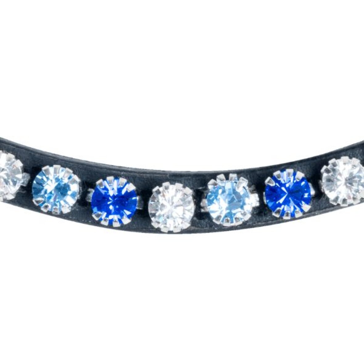 Løst pandebånd fra Waldhausen. Dette pandebånd er let buet og er med blålige og klare krystaller. Læder ender med Waldhausen logo i den ene ende.
