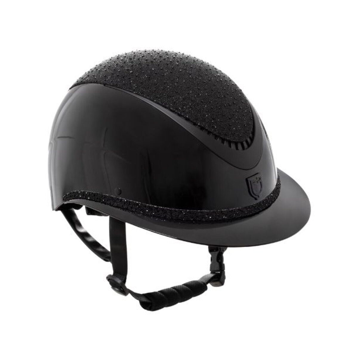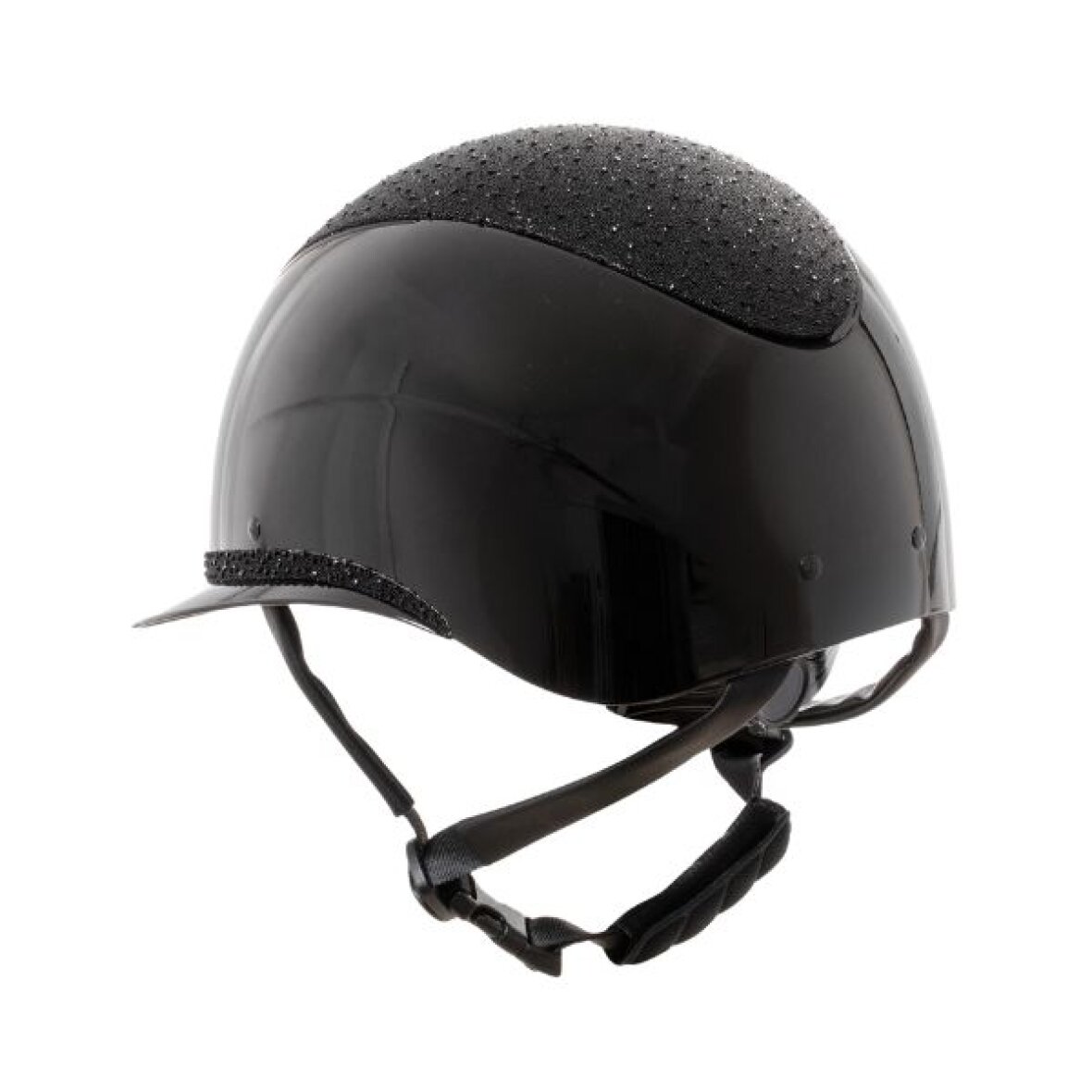 Flot og elegant letvægt ridehjelm fra Equestro. Denne ridehjelm er glossy med top og frontbånd i sorte rhinesten som glimter smukt i lyset. Den er med gode ventilationshuller og har åndbar liner indvendig. Ridehjelmen justeres i størrelse i nakken og har justerbare hagestopper. Equestro logo patch i fronten.