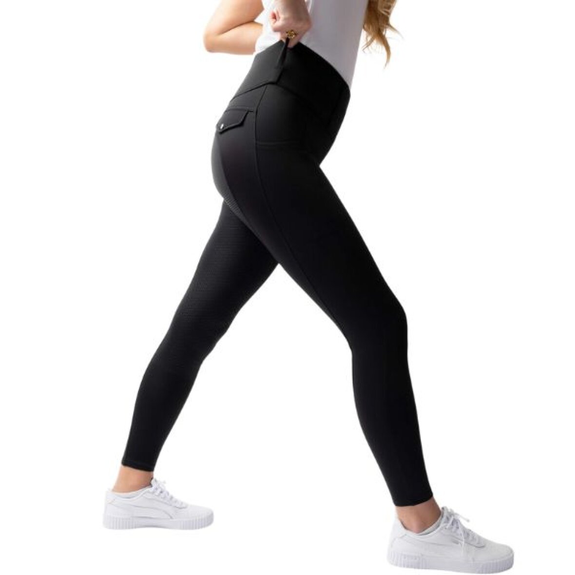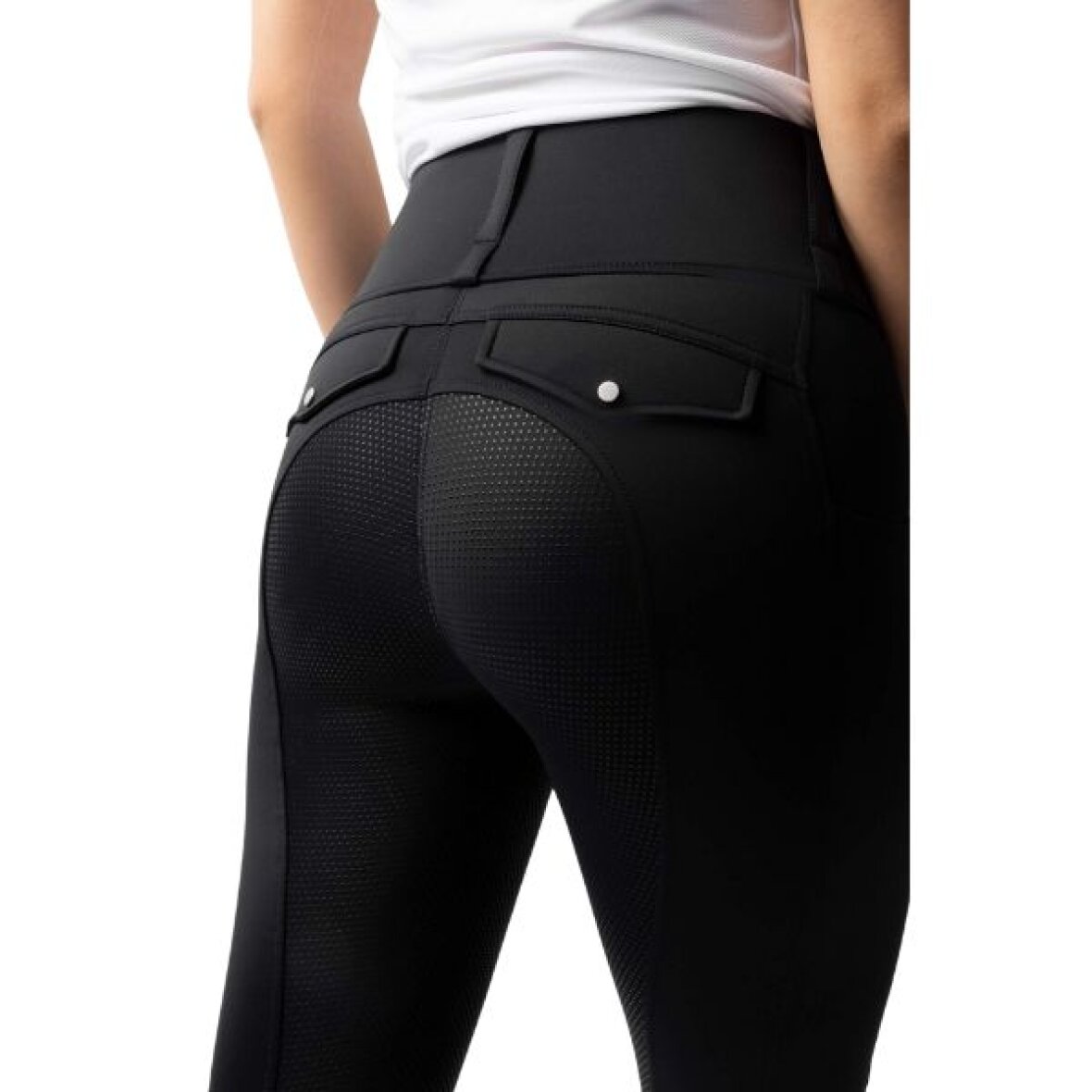 Flotte ridetights fra Horze. Disse ridetights er med høj talje i bred elastik og med bæltestropper. De er fremstillet i funktionelt åndbart materiale med fuld silikone grip. De er med telefonlommer på begge lår og har falske baglommer for at give et pænt udseende.