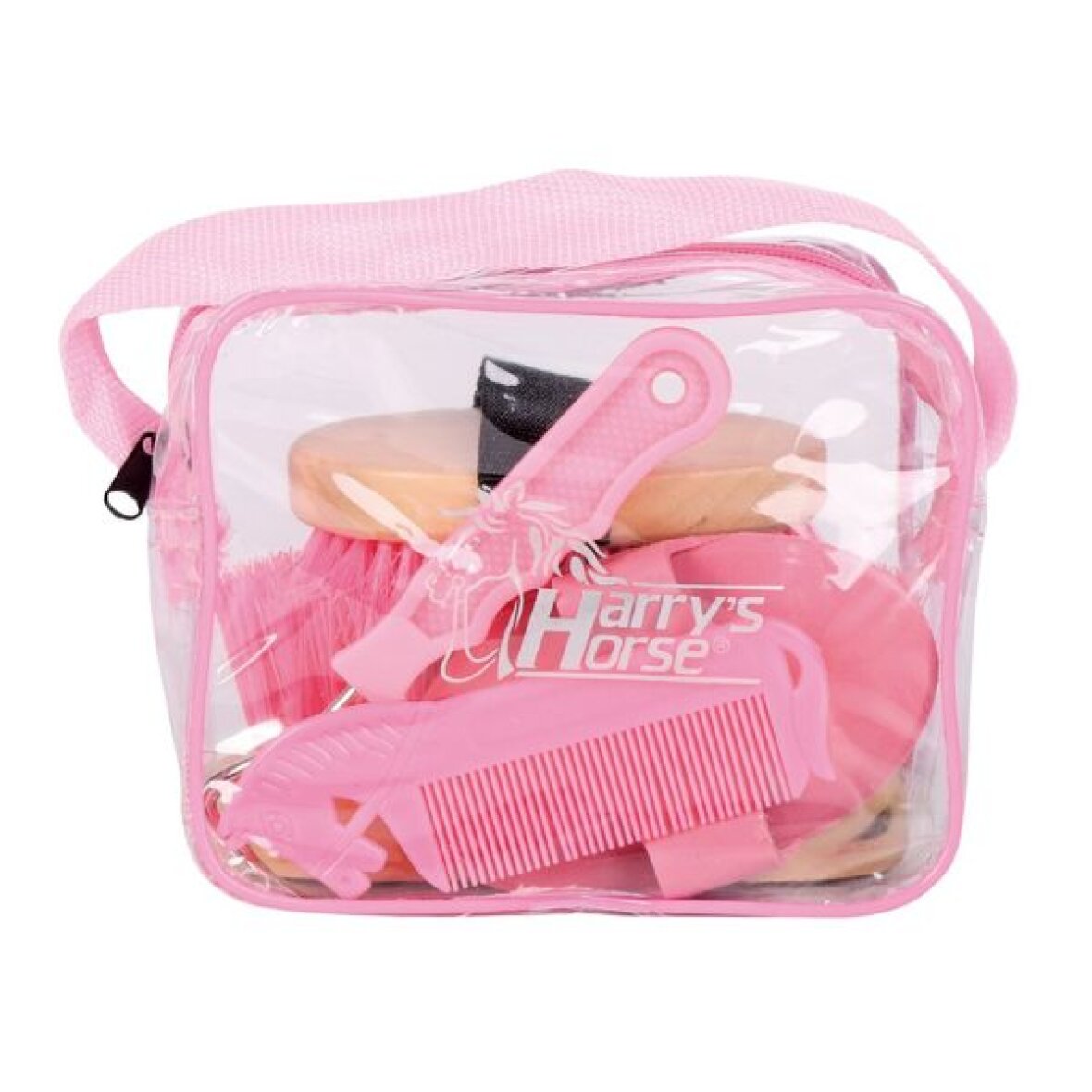 Striglesæt i lille sød taske fra Harrys Horse. Dette striglesæt består af en hoverenser, mankam, stiv kropsbørste, dandy børste og en gnubbe strigle.