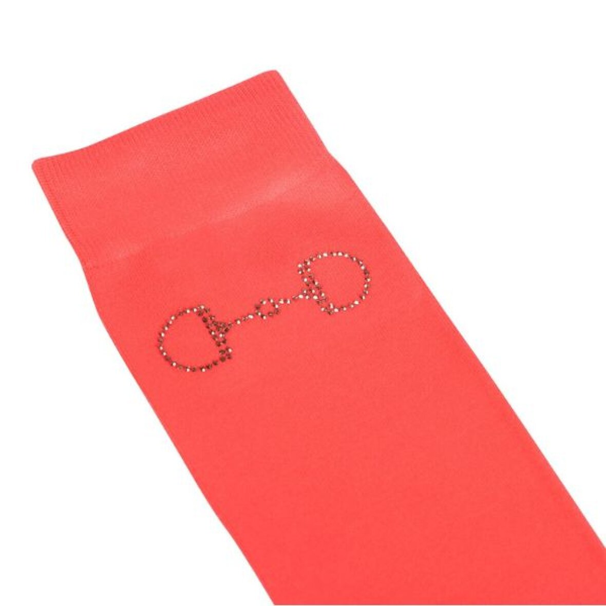 Knæhøje børne ridestrømper i koral med et bid øverst i matchende krystaller.