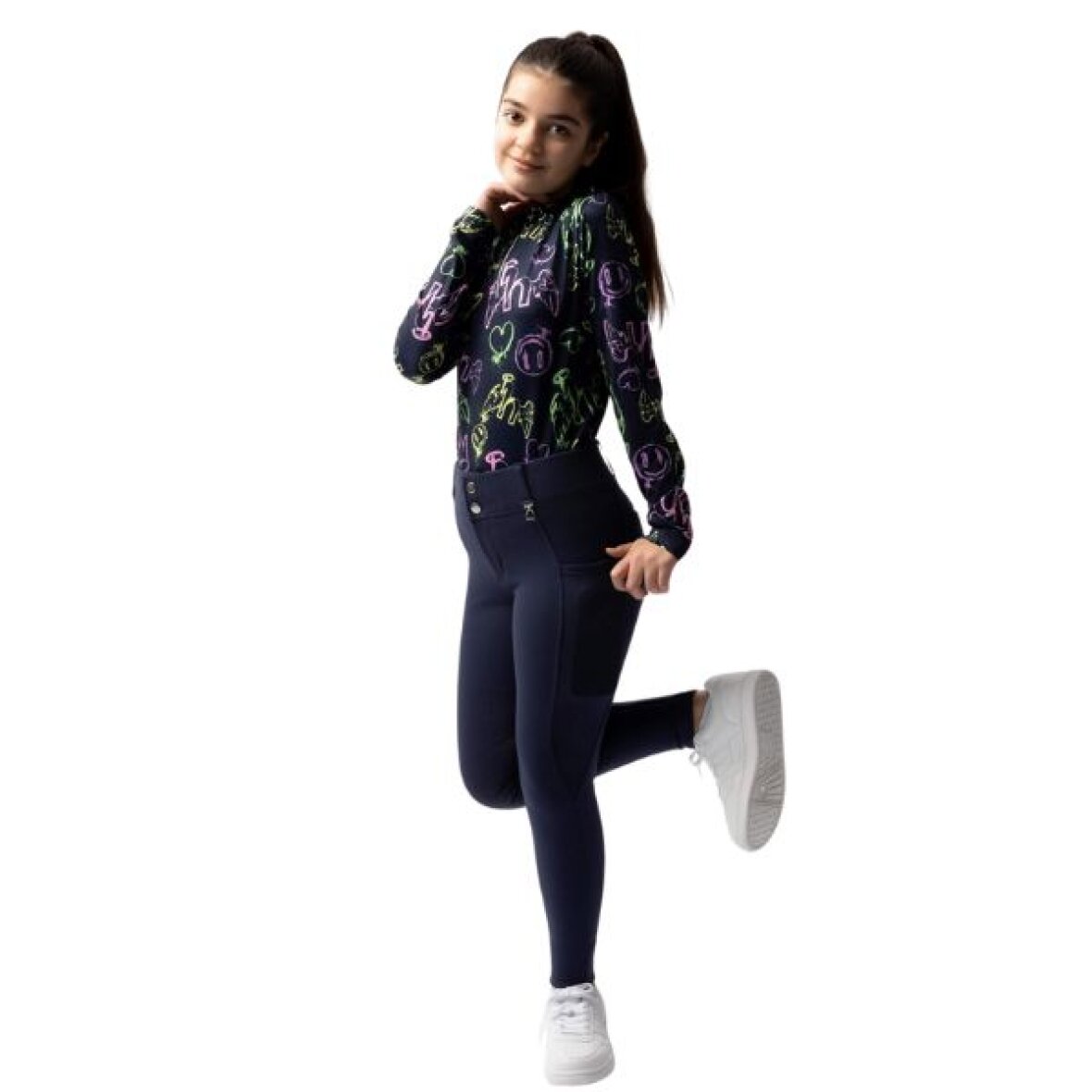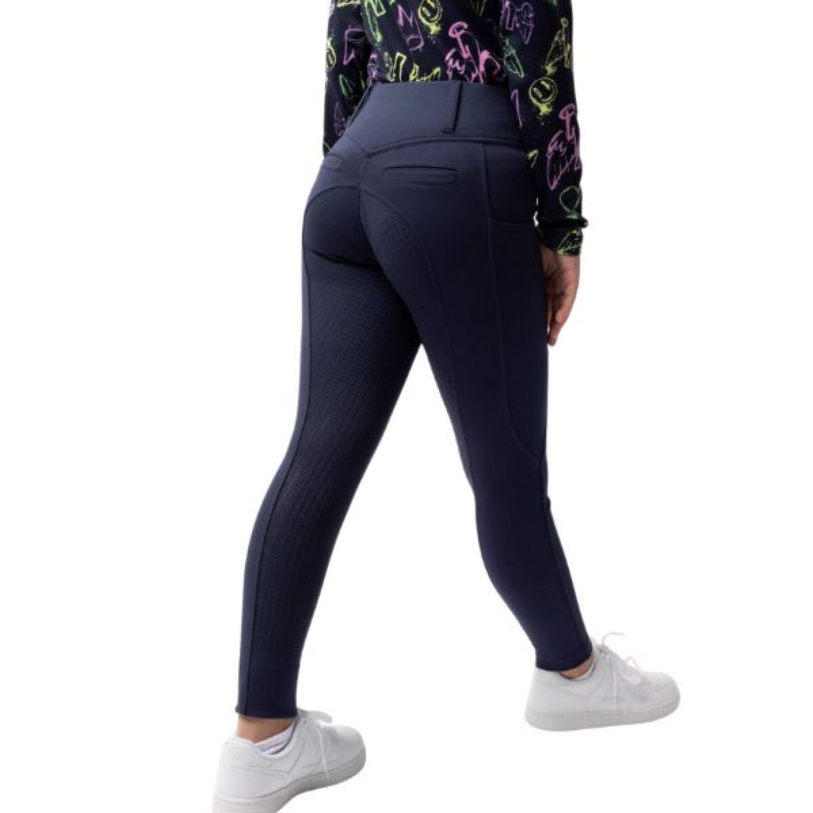 Børne ridebukser fra Horze. Disse børne ridebukser er med fuld silikone grip og bred støttende linning. De er med bæltestropper og fremstillet i åndbart materiale som gør dem behagelige at have på. Ridebukserne er med 2 telefonlommer og lille Horze logo patch i den ene bæltestrop.