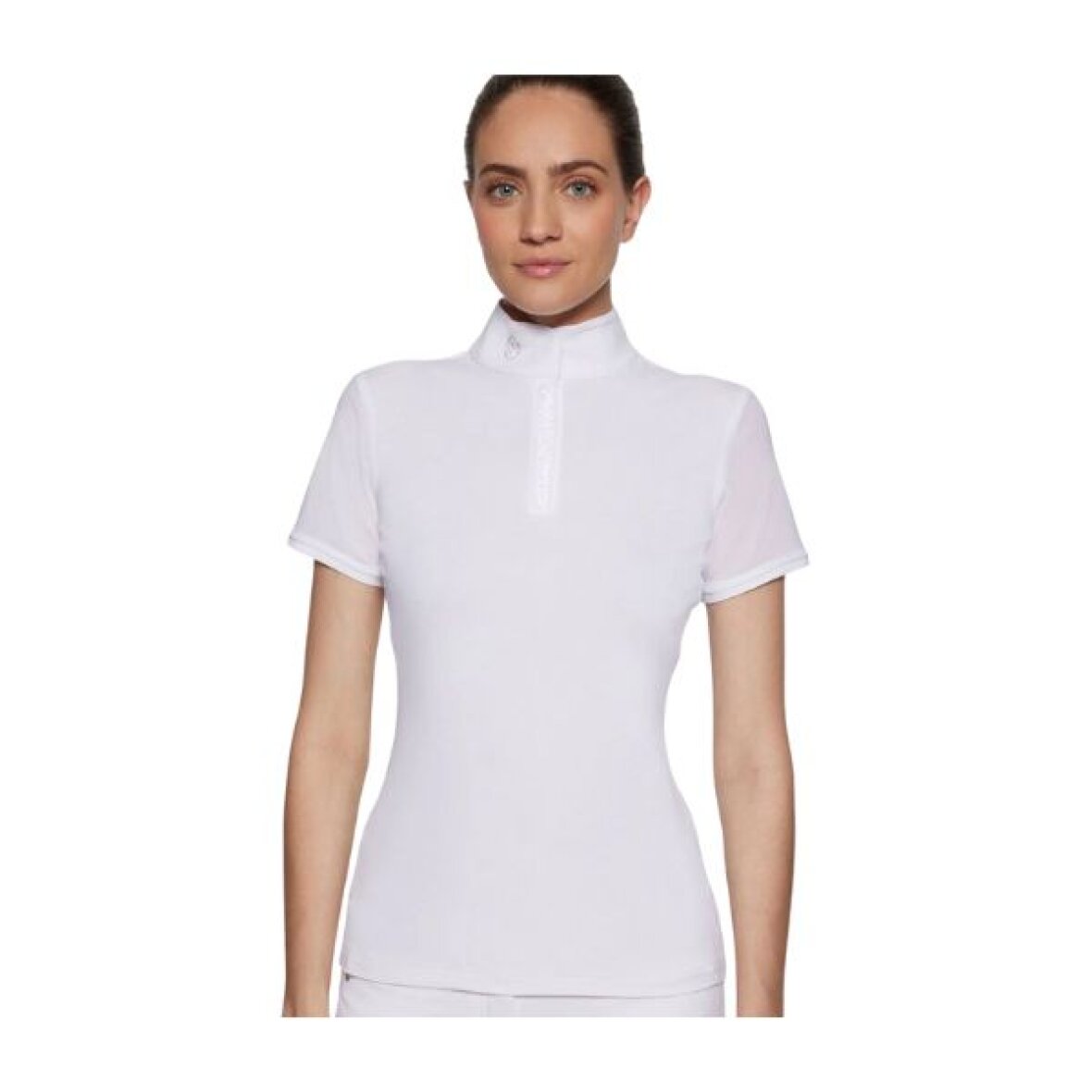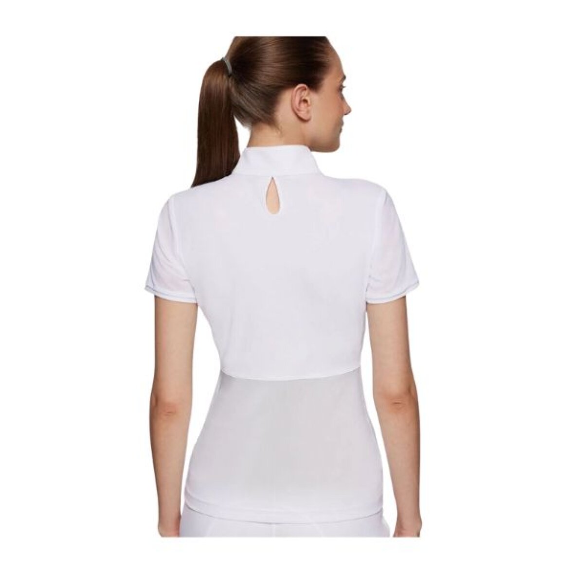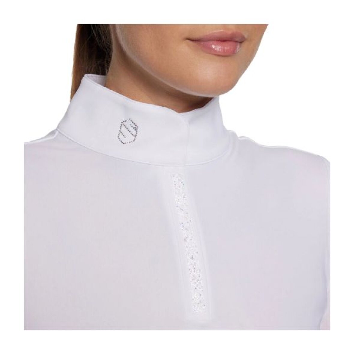 Elegant stævnebluse fra Samshield. Stævneblusen er fremstillet i krøllefrit, hurtigtørrende og UV-beskyttende materiale. Stævneblusen har mesh-materiale på ærmerne og den nederste del af ryggen, som giver god ventilation under stævnejakken. Bag på er der et lille hul i nakken for at give ekstra luft. Den har en høj krave med Samshield logo i swarovski sten og lukkes med to skjulte knapper og en kort skjult lynlås med hvide og sølv swarovski sten.