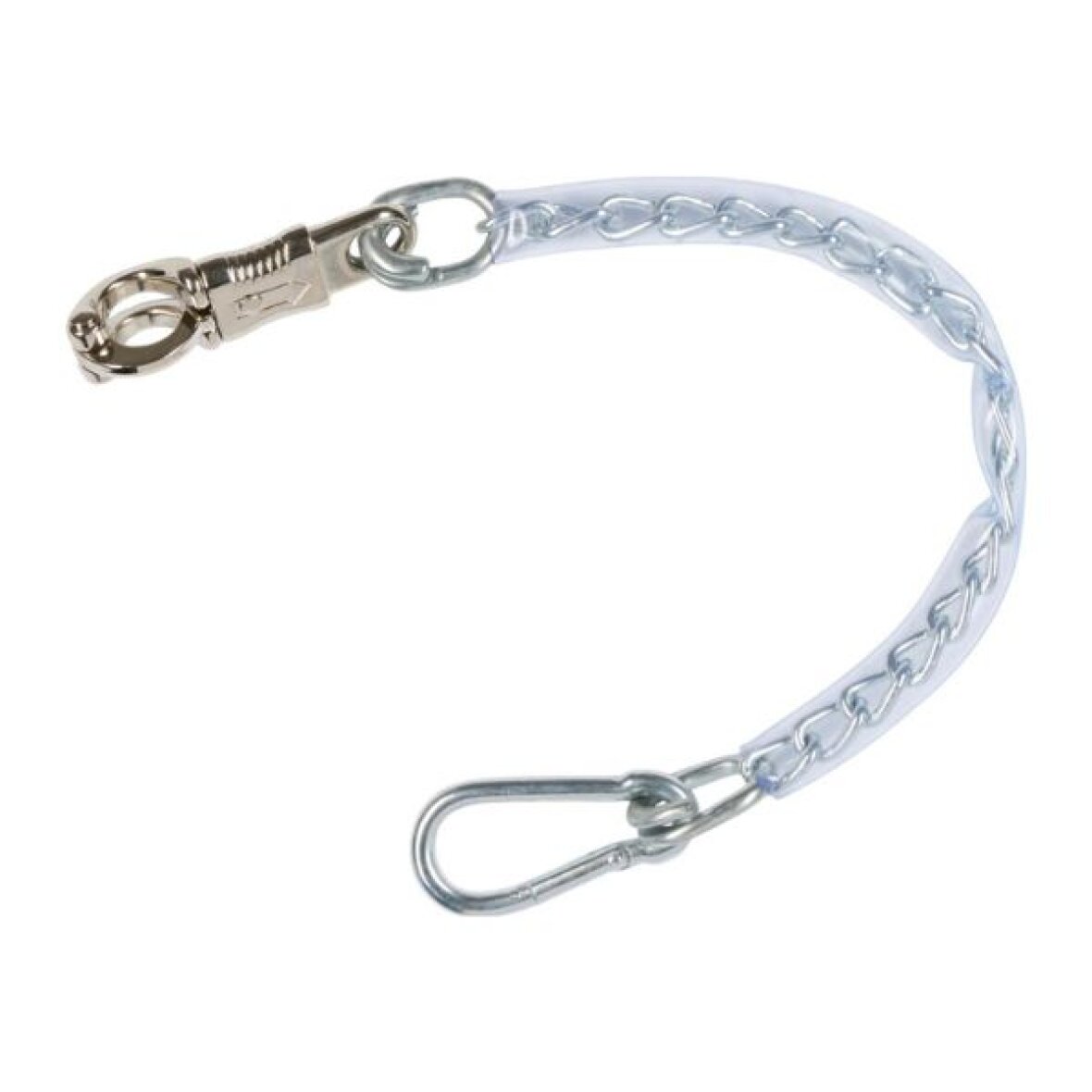 Aftagelig trailerstrop i metal dækket i blødt plastik. Det bløde plastik hylster forhindrer skader på metallet og beskytter hesten mod skader fra kæden. Trailerstroppen har en standard karabinhage til fastgørelse på et fast bindepunkt og panikhage til fastgørelse i grime.