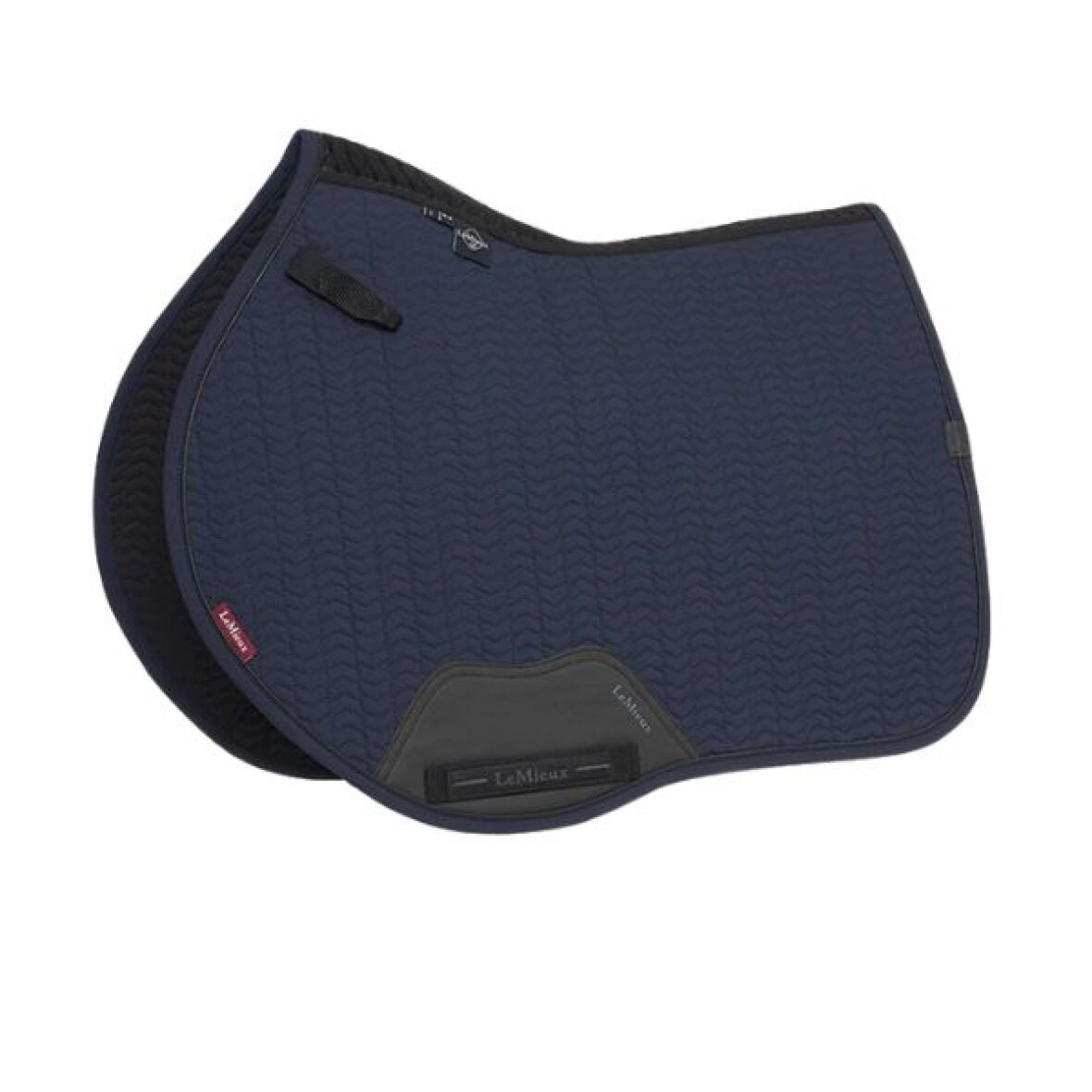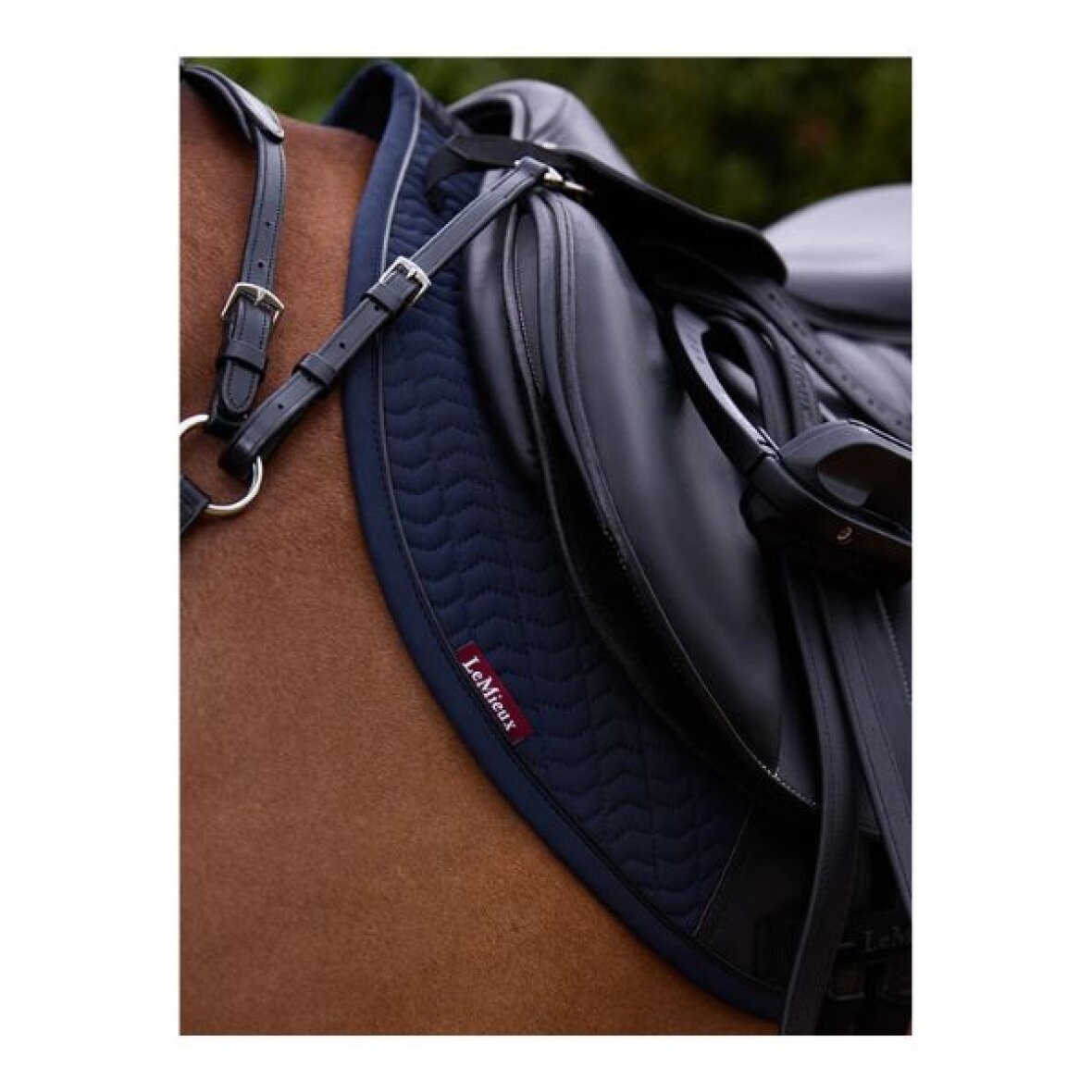 Springunderlag fra LeMieux. Dette underlag er designet med teknisk ydeevne og i softshell-stof. Den høje mankefacon reducerer tryk og forbedrer sadlens pasform. Den bløde, åndbare foring med selvkølingseffekt er vævet med kølefibre, der leder varme væk fra huden og effektivt absorberer sved. Jo varmere hesten bliver, desto mere arbejder den fugtaktiverede kølingsforing under sadlen. Underlaget er udstyret med kunstlæder ved gjordområdet for at forhindre slid. En LeMieux-mærket læderdetalje tilføjer en eksklusiv afslutning til underlaget.